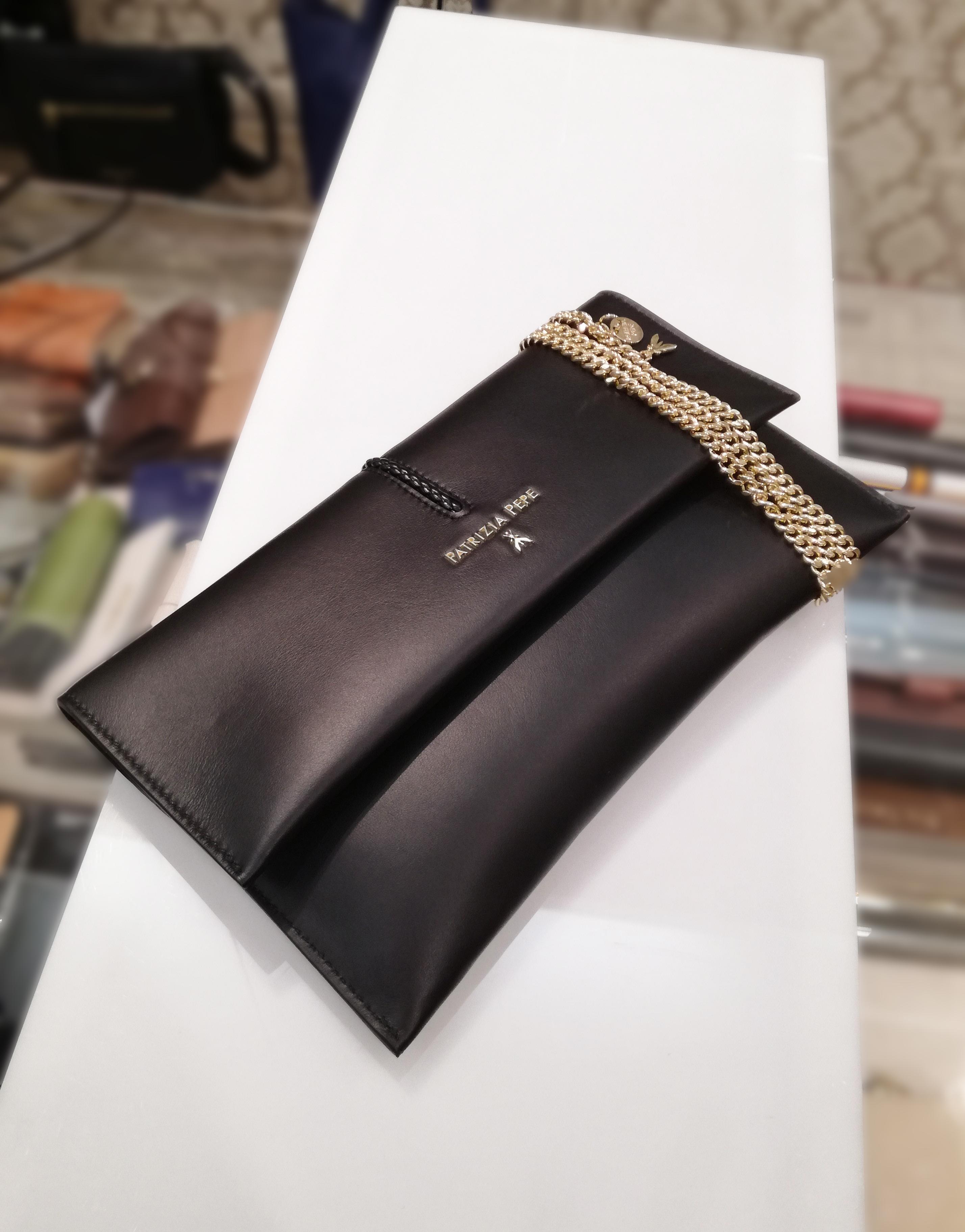 Pochette in pelle. Tracolla metallizzata staccabile. Disponibile in diversi colori
