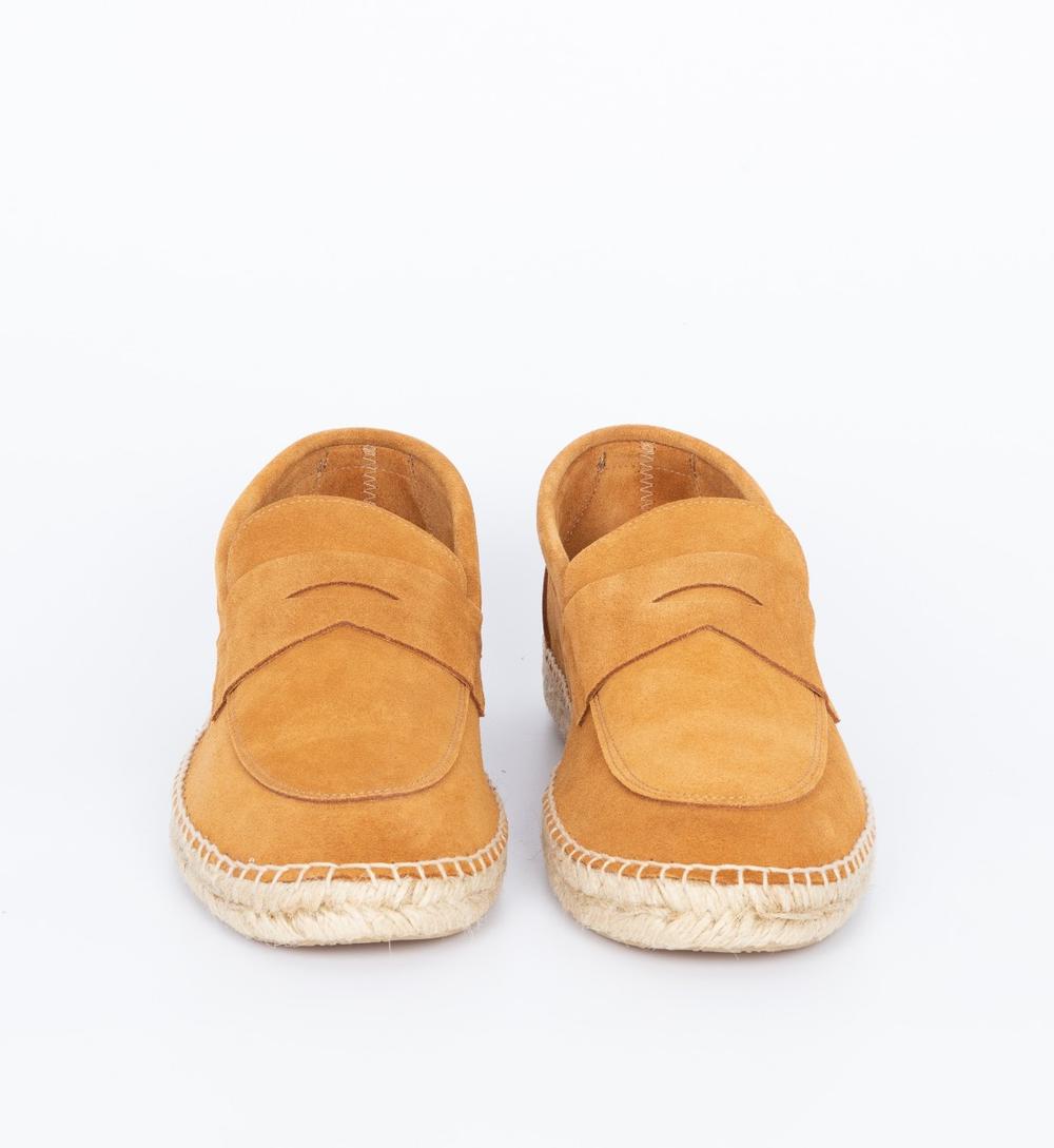 Mocassino in suede color ocra. Suola in iuta con battistrada in gomma. Sottopiede interno in pelle bovina, con lamina in schiuma di lattice. Realizzato interamente a mano da artigiani spagnoli.