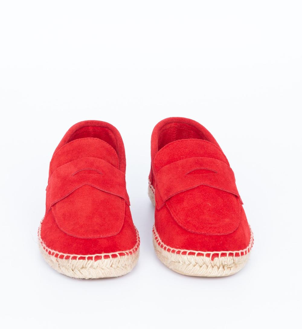 Mocassino in suede color rosso. Suola in iuta con battistrada in gomma. Sottopiede interno in pelle bovina, con lamina in schiuma di lattice. Realizzato interamente a mano da artigiani spagnoli.