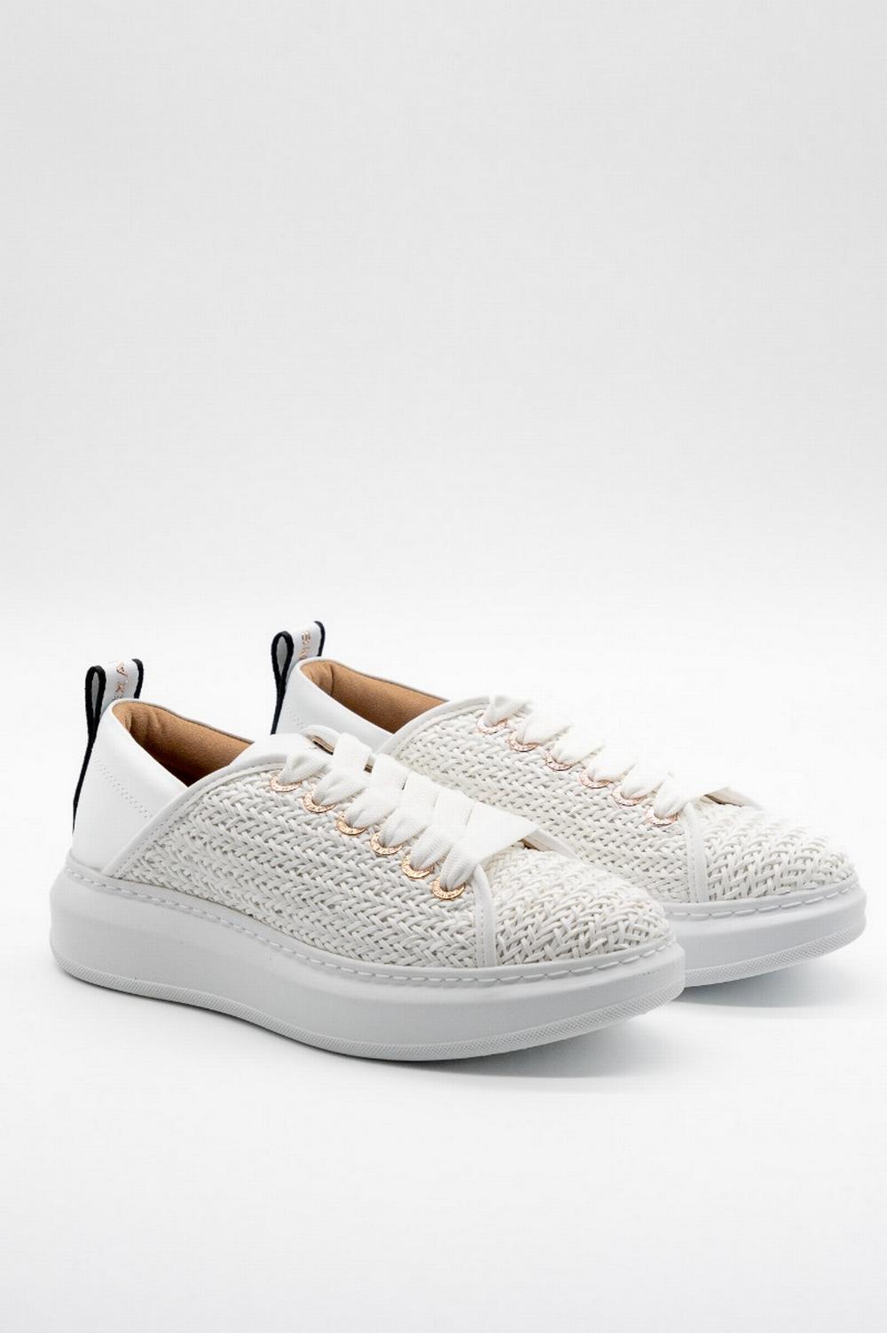Sneaker modello Wembley, icona del brand. Tomaia in raffia bianca intrecciata, tallone in pelle bianca. Fettuccia posteriore in gross grain bianco e logo lettering rose gold in rilievo. Occhielli in metallo color rose gold. Stringa a nastro bianca. Suola in gomma bianca, altezza totale percepita 4,5cm.