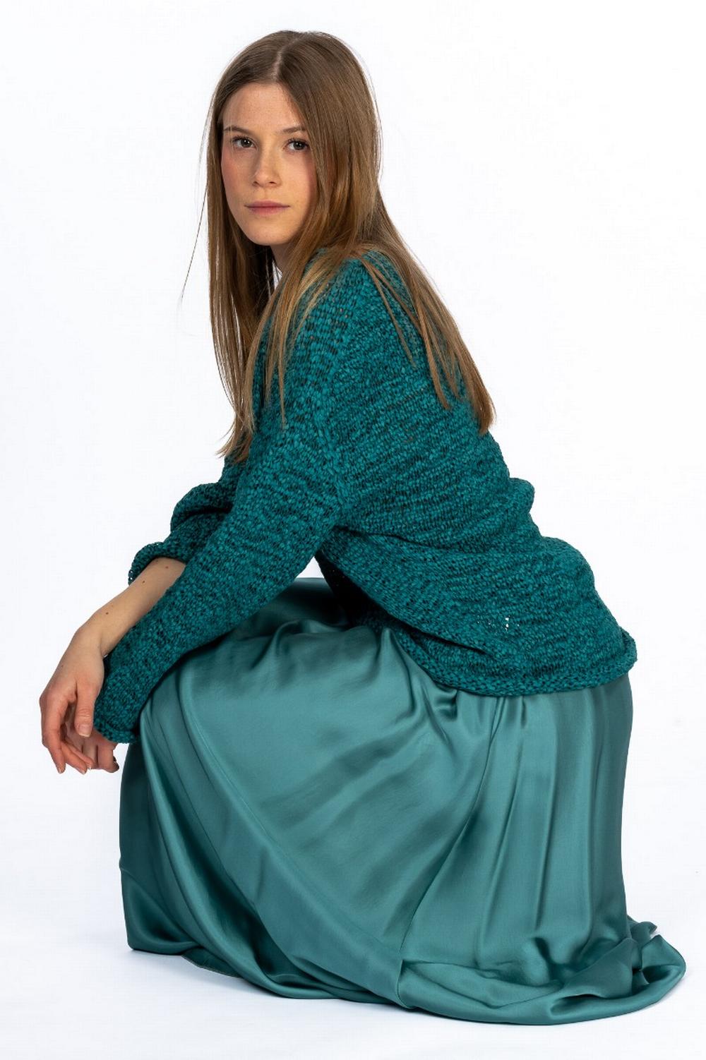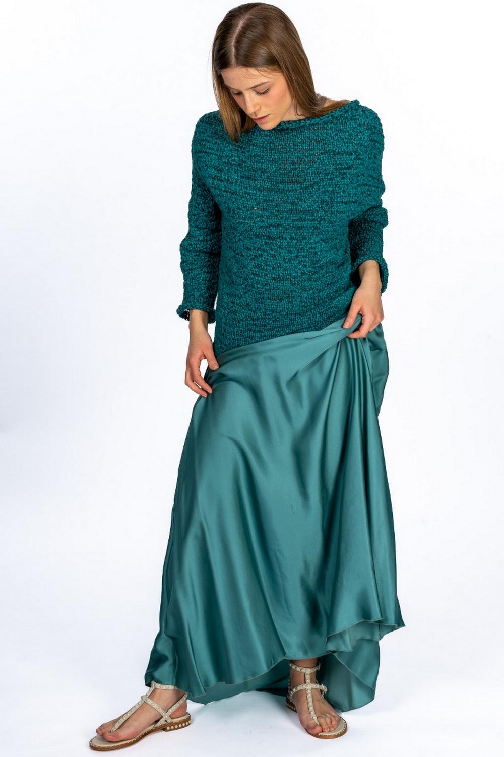 Gonna lunga in viscosa di colore verde ottanio. Elastico in vita. Linea fluida.