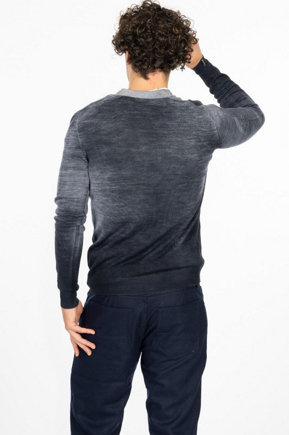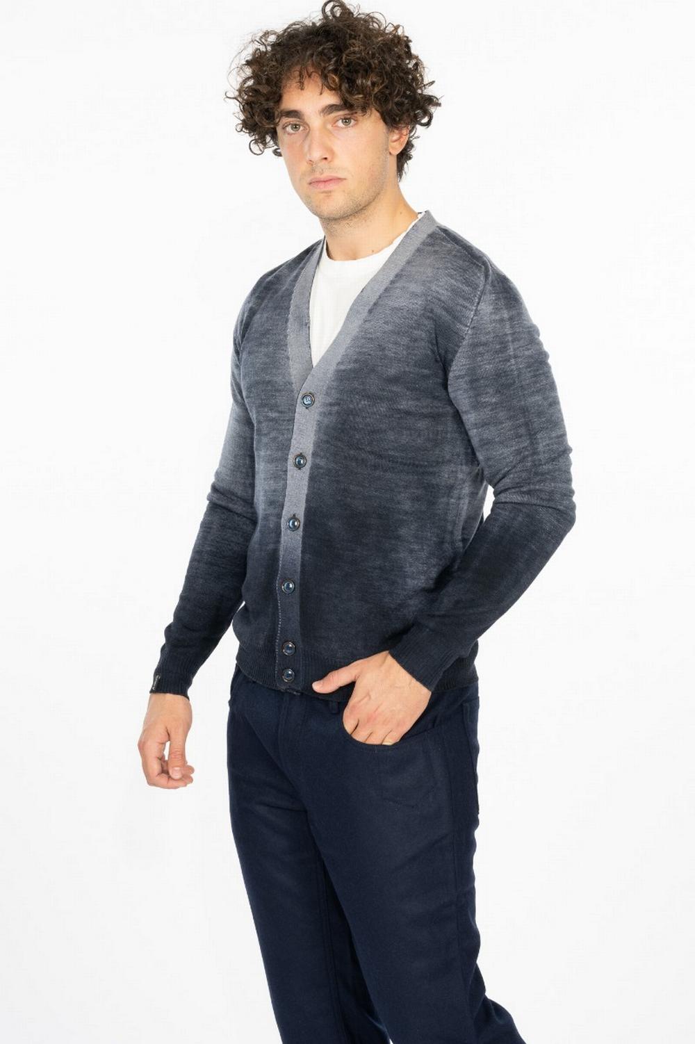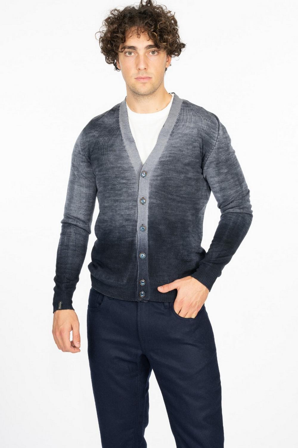 Cardigan in pura lana di colore grigio melange con sfumature blu. Scollo a V con chiusura con bottoni. Bordi in costina. Spalla a martello. Senza cuciture, realizzata da un unico filo che costruisce l'intero capo senza mai interrompersi. All'interno è di colore colore blu unito.