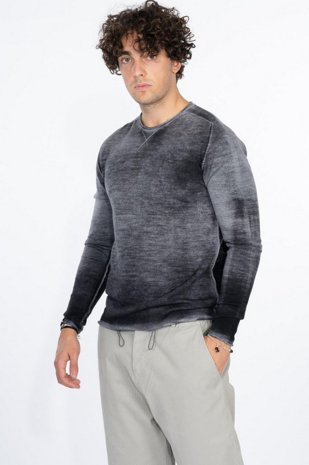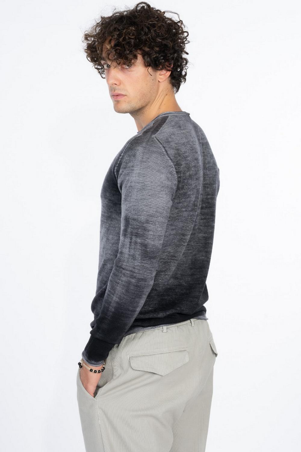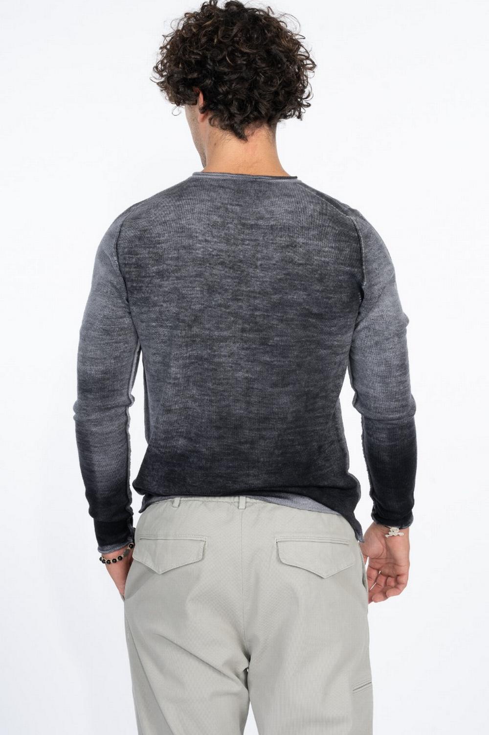 Maglia in pura lana di colore grigio melange, girocollo, con bordi rollè. Motivo a triangolo sotto il collo. Spalla a martello. Senza cuciture, realizzata da un unico filo che costruisce l'intero capo senza mai interrompersi. Ha la peculiarità di poter essere indossata anche a rovescio. All'interno color antracite.