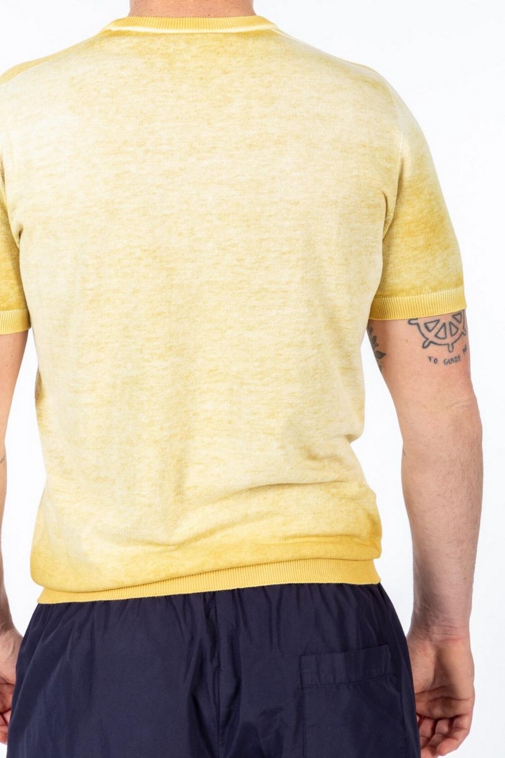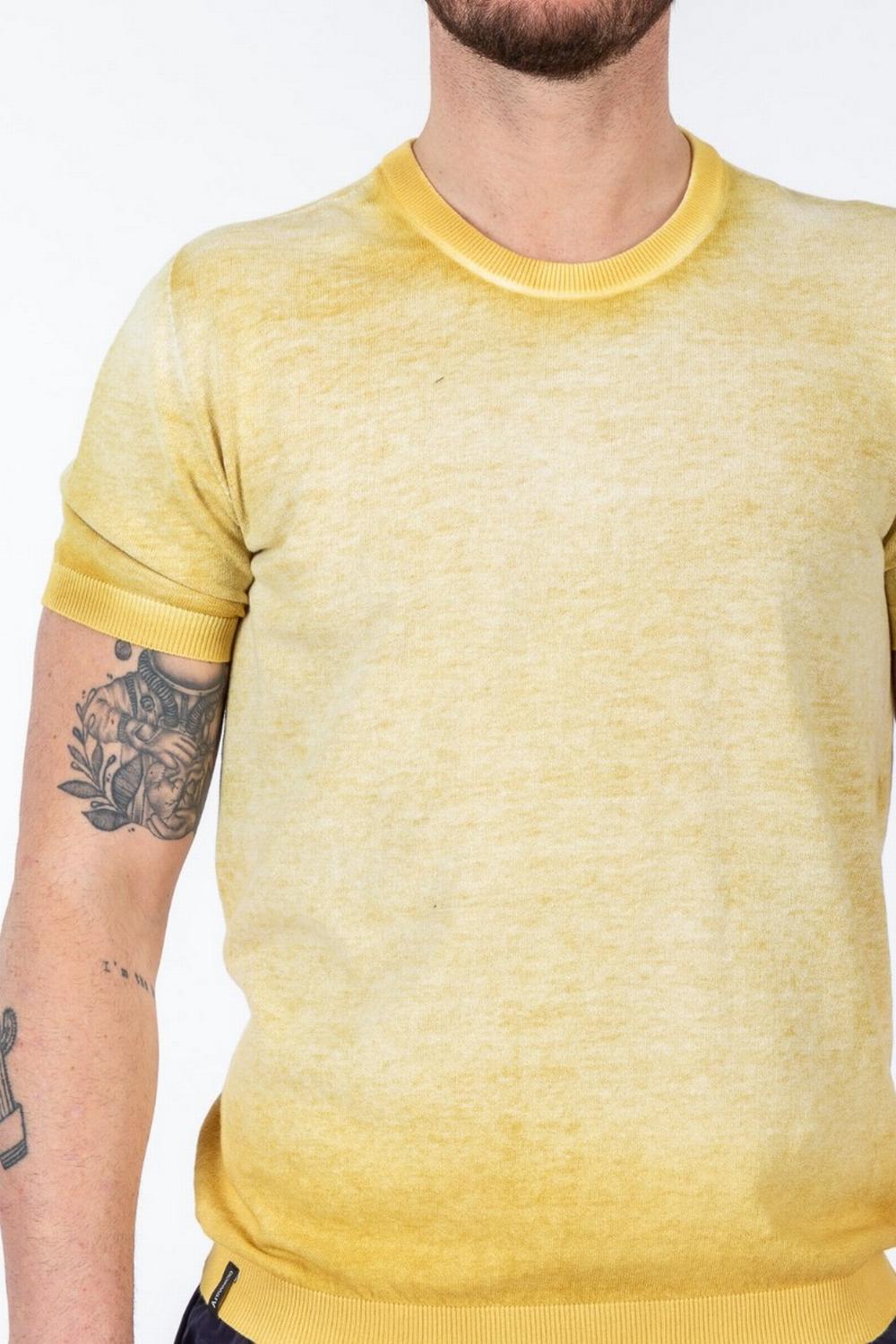 Maglia a maniche corte, realizzata in un unico filo, senza cuciture. Indossabile anche a rovescio. Colore giallo, da un lato trattato con colore non uniforme, dall'altro lato in tinta unita.