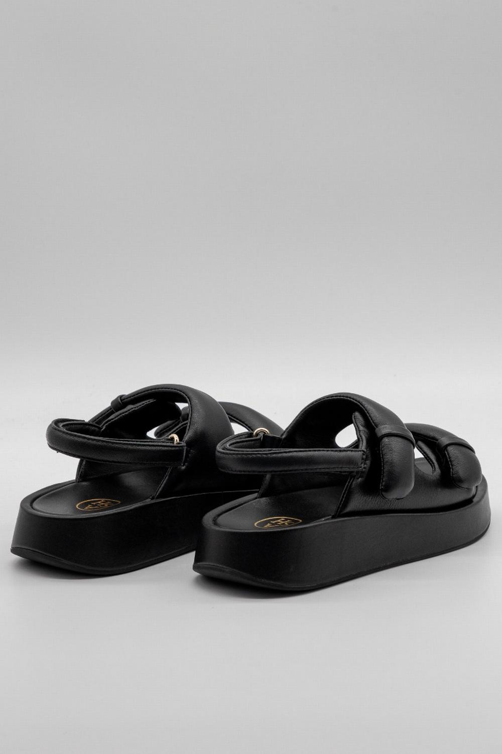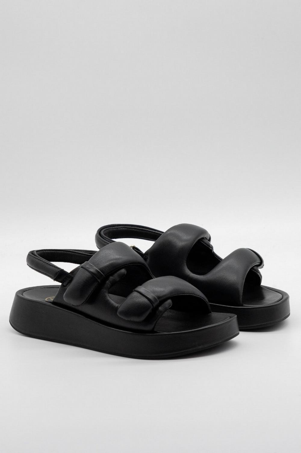 Sandalo in pelle di colore nero. Due fascioni frontali leggermente imbottiti, chiusura posteriore con velcro. Maxi suola in pelle nera con battistrada in gomma tono su tono.