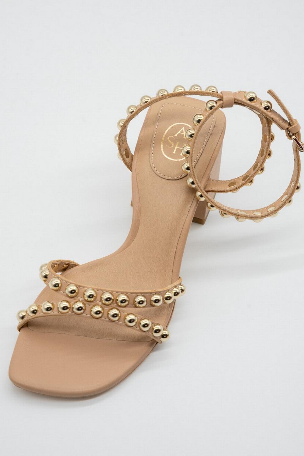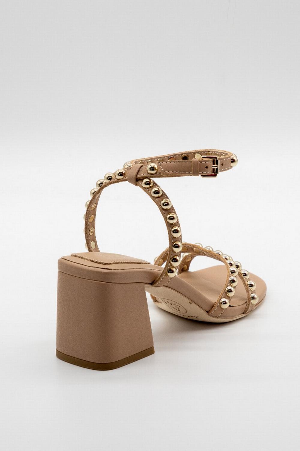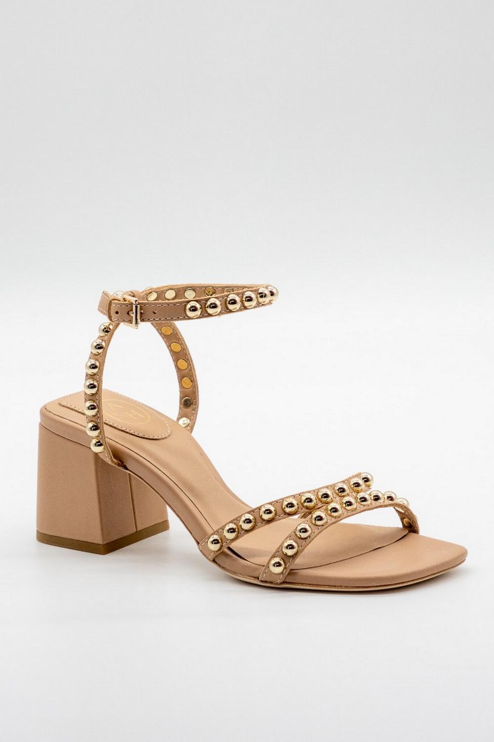 Sandalo in pelle color naturale. Tacco largo squadrato altezza 7cm con fondo in gomma. Cinturini in pelle con borchie semisferiche metalliche color oro. Punta squadrata. Suola in pelle.