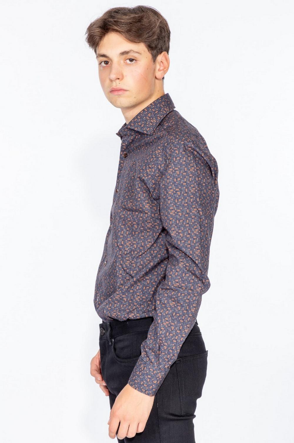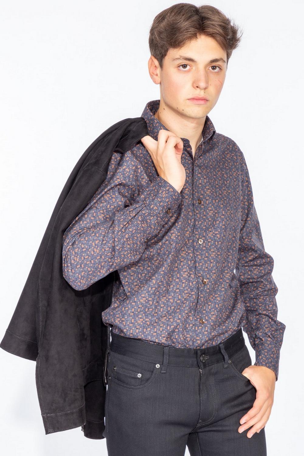 Camicia in jersey di cotone con fantasia geometrica sui toni del blu scuro e marrone. Bottoni in tinta. Collo aperto alla francese. Polso tondo. Slim fit. Linea Culto, dall'aspetto classico ma confezionata con particolari tecniche che garantiscono un ottimo comfort.