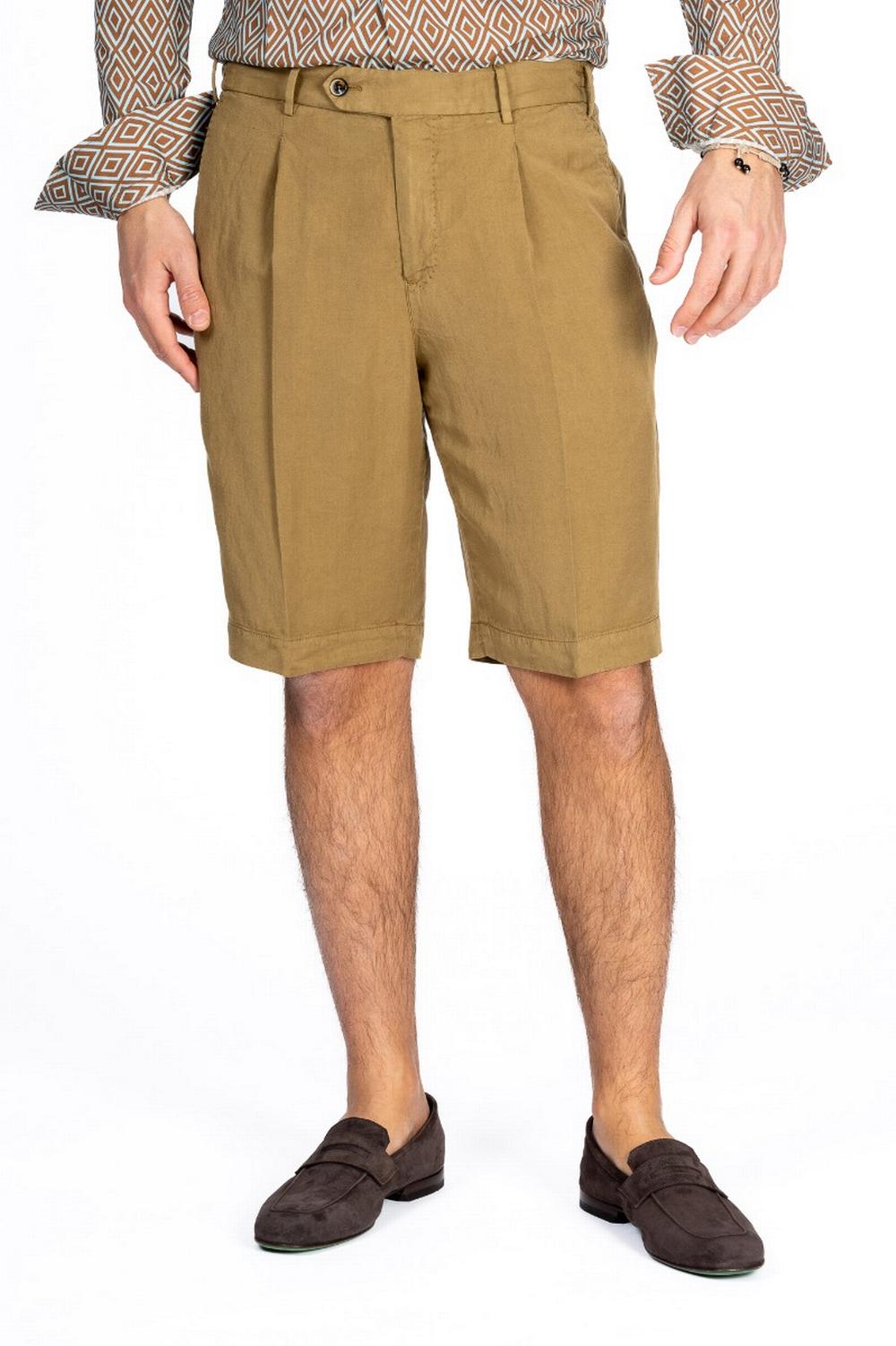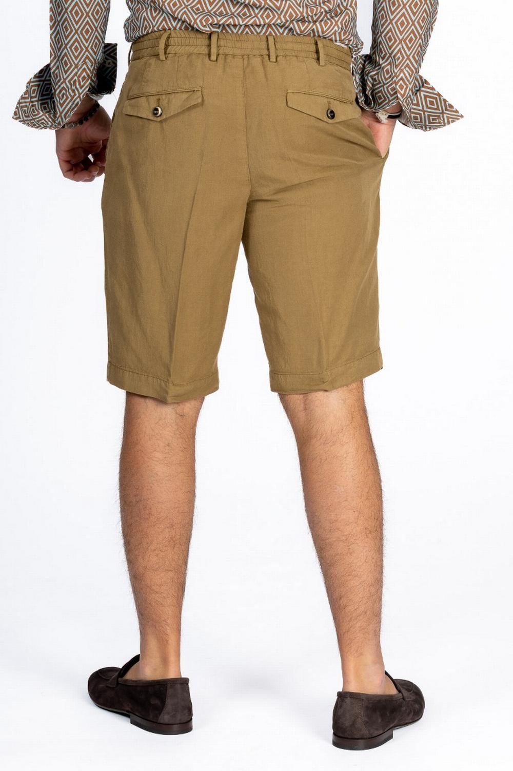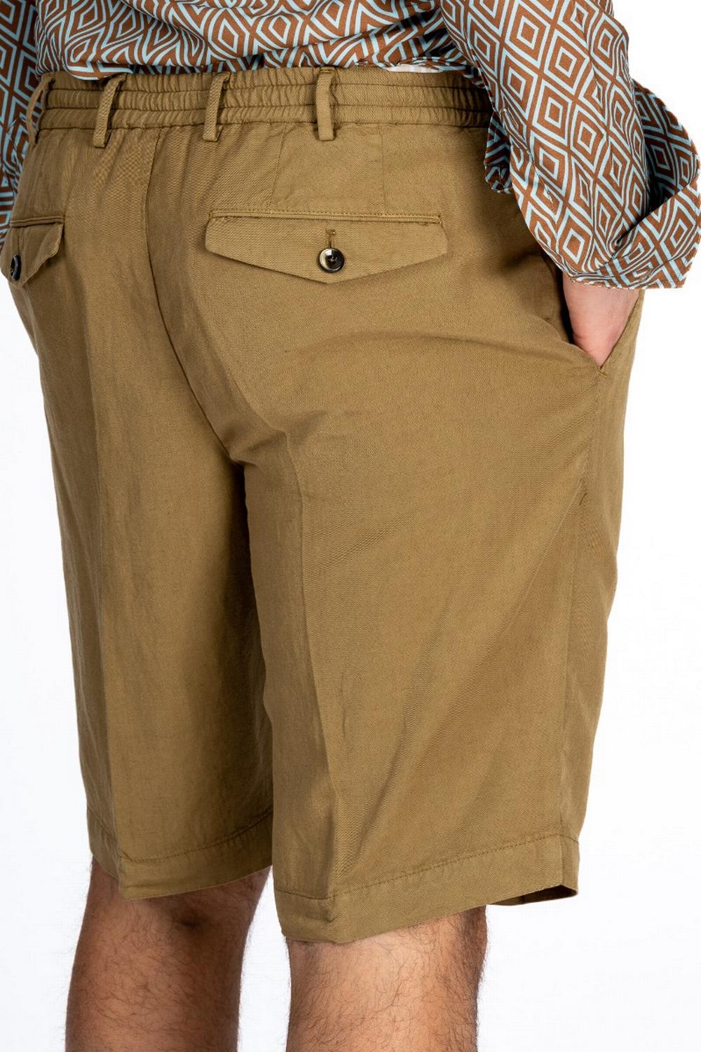 Bermuda in morbido tessuto Lyocell misto lino color tabacco. Linea sartoriale con pinces sul fronte e piega centrale stirata. Elastico in vita sul retro e coulisse interna. Chiusura con zip e doppio bottone. Tasche laterali america e con patta e bottone sul retro. Passanti in vita.