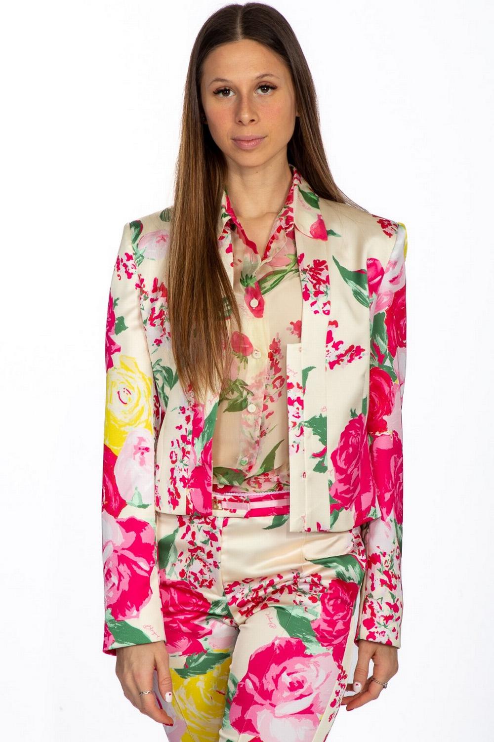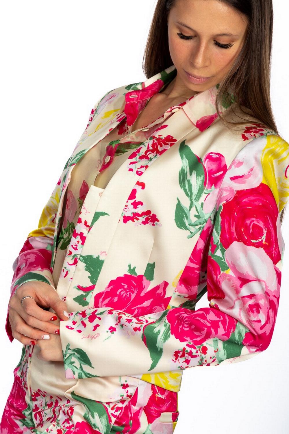 Giacca in tessuto di raso. Fantasia floreale rosa e verde su fondo avorio. Scollo a scialle. Chiusura con gancetti invisibili. Foderata internamente. Linea corta e leggermente sciancrata.