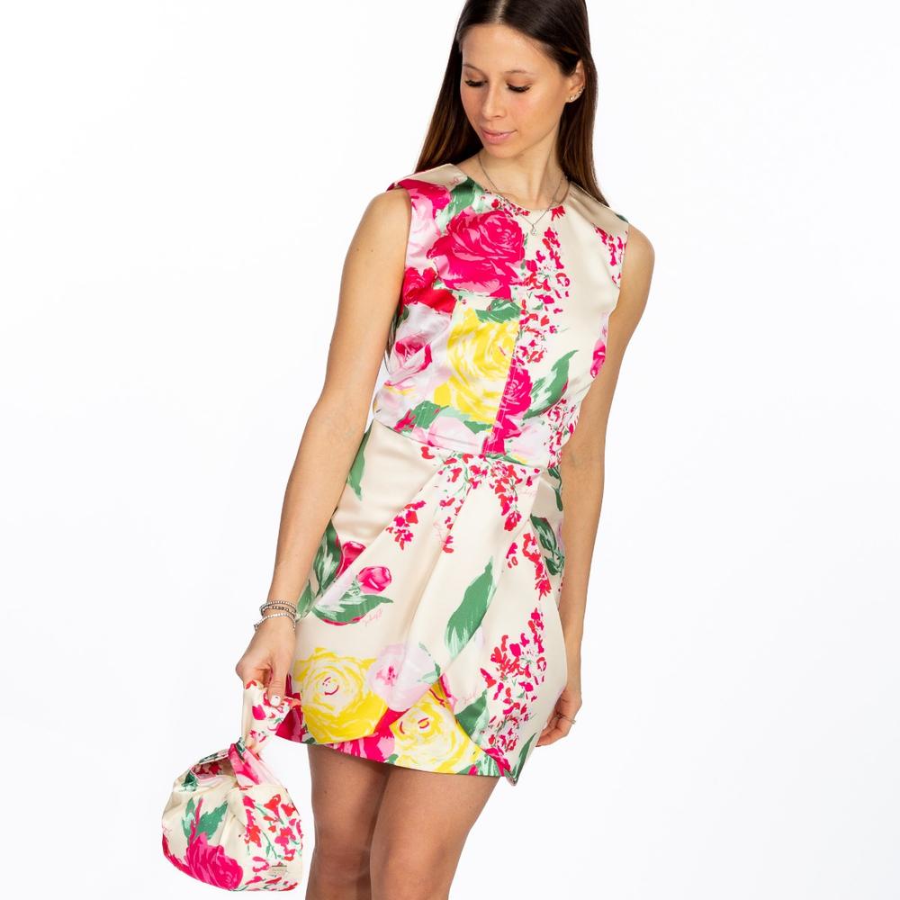 Abito in raso leggermente elasticizzato. Stampa floreale sui toni del rosa e verde su fondo avorio. Top sbracciato e con scollo tondo con profilo sottile dorato. Cucitura in vita. Gonna modello tulipano. Chiusura con zip centrale posteriore. Fodera interna in leggero crepe color rosa.
