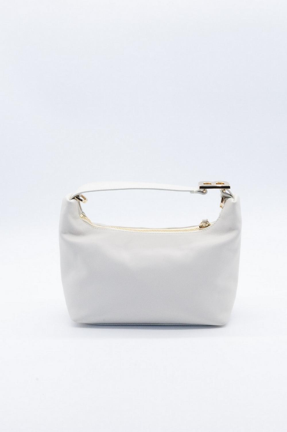 Borsa in pelle liscia e morbida color latte. Chiusura superiore con zip e tirazip in pelle. Manico in pelle per uso a mano e tracollina crossbody. Logo monogram in metallo dorato sul manico. Una tasca interna con zip.