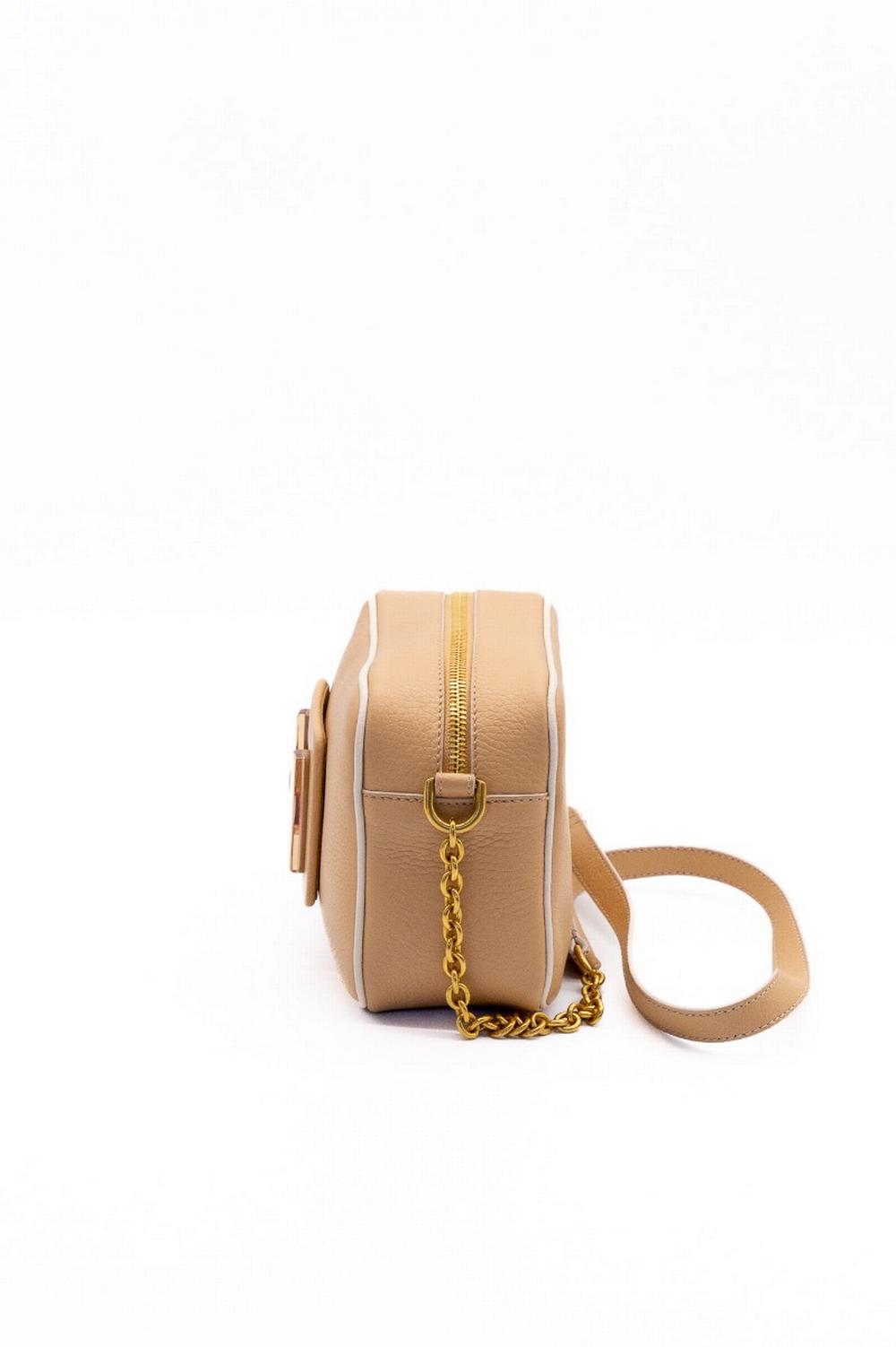 Mini camera bag, in pelle martellata color sabbia con profili panna. Logo monogram in plexiglass semitrasparente, applicato frontalmente. Chiusura superiore con zip dorata. Tracolla in pelle e catena. Una tasca interna applicata.