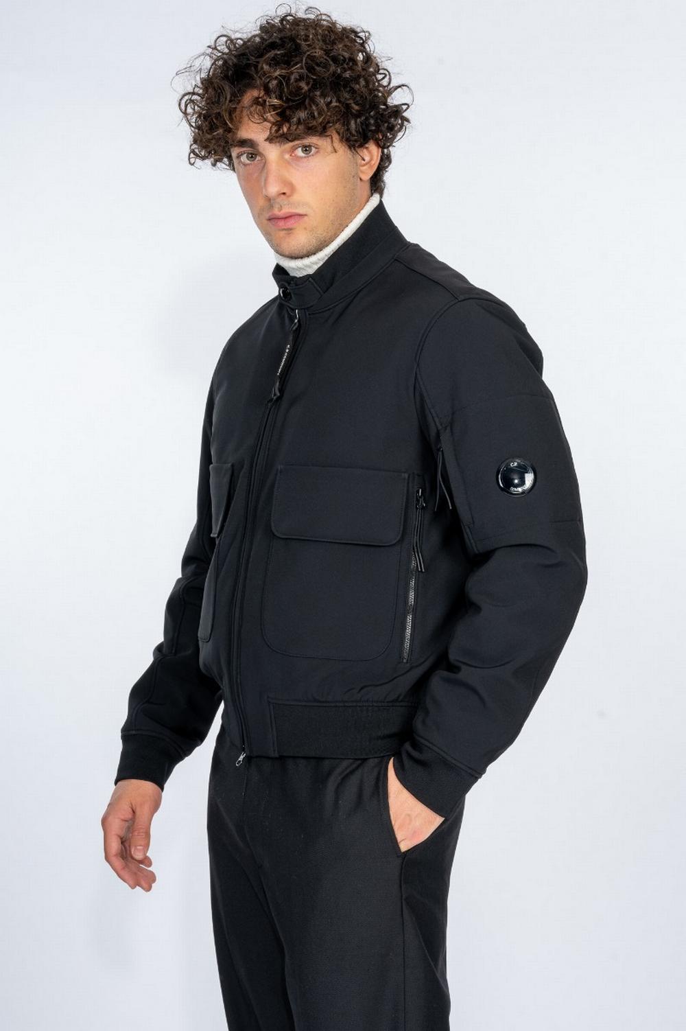 Giubbino modello bomber in tessuto shell stretch nero. Interno in pile. Chiusura con zip a doppio cursore e automatico al collo. Due maxi tasche con patta applicate sul fronte, con zip laterale. Una tasca sulla manica sinistra con lente , icona del brand. Collo, polsi e fondo in costina elasticizzata.