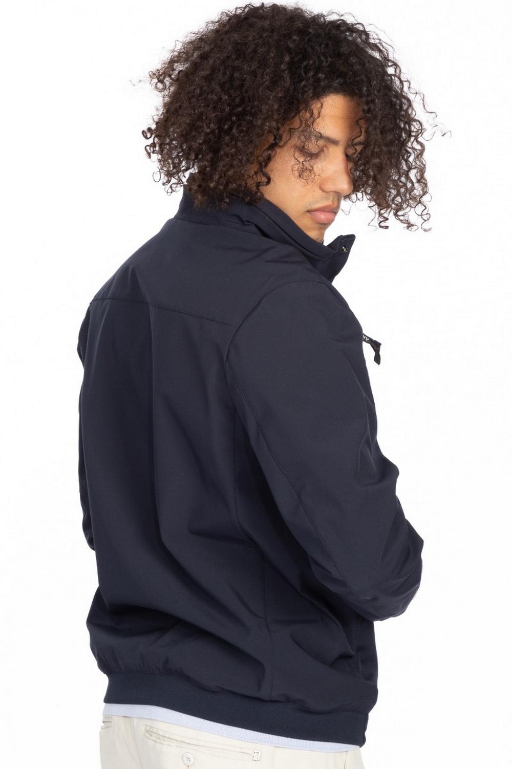 Giacca bomber in tessuto tecnico stretch Soft-Shell blu scuro, ad alta traspirabilità , resistente all'acqua e al vento. Collo alto con cappuccio inserito. Chiusura con zip a doppio cursore nascosta. Tasche laterali con zip, una tasca sulla manica con zip e una tasca interna. Polsi e fondo in costina elasticizzata. Lente sulla manica, logo del brand.