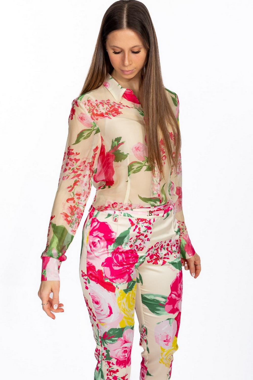 Camicia in leggero tessuto misto viscosa. Fantasia floreale rosa e verde su fondo avorio. Semitrasparente, linea fluida. Colletto e polsi classici. Chiusura con bottoni rivestiti.