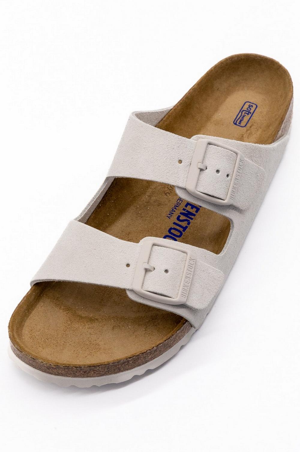 Ciabatta dalla linea essenziale, in morbido suede bianco antico. Due cinturini con fibbia in metallo verniciato tono su tono, con logo inciso. Senza cuciture. Plantare anatomico in sughero, con sottopiede in nabuck. Battistrada in Eva bianco antico. Fit stretto.