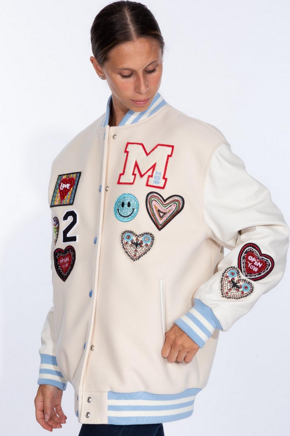 Piumino corto, in nylon semi lucente avorio, con trapuntature diagonali. Chiusura con zip tono su tono, collo alto, cappuccio fisso con coulisse. Fondo con elastico. Polsini con bottone. Logo patch applicato sulla manica sinistra. Tasche laterali inserite nelle cuciture, con zip. Interno avorio lucido.