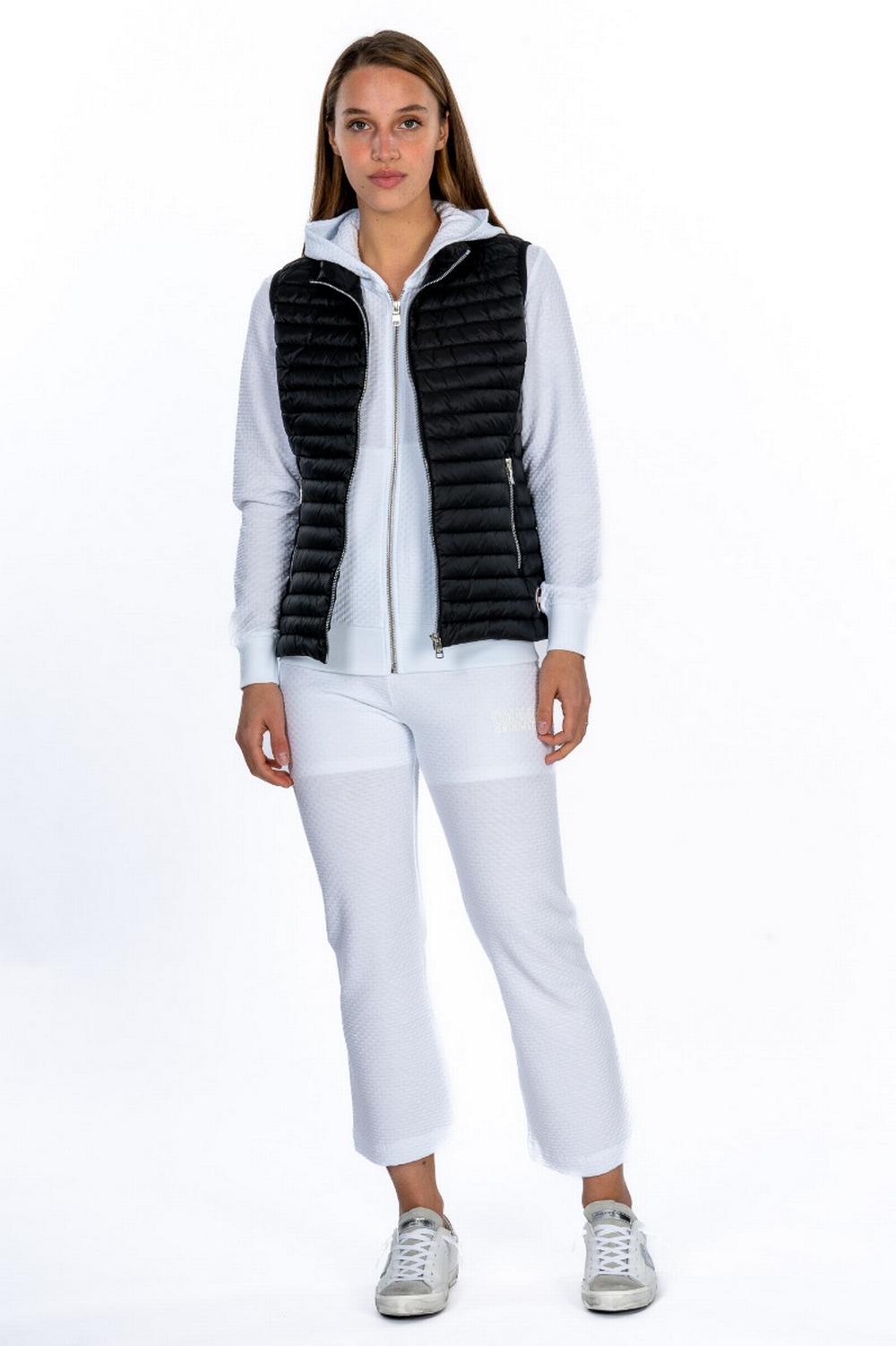 Piumino smanicato leggero, in nylon mano seta nero, con trapuntature sottili. Chiusura con zip silver. Colletto in piedi. Tasche verticali con zip. Giromanica in tessuto elasticizzato nero. Sciancrato in vita. Coulisse interna sul fondo.