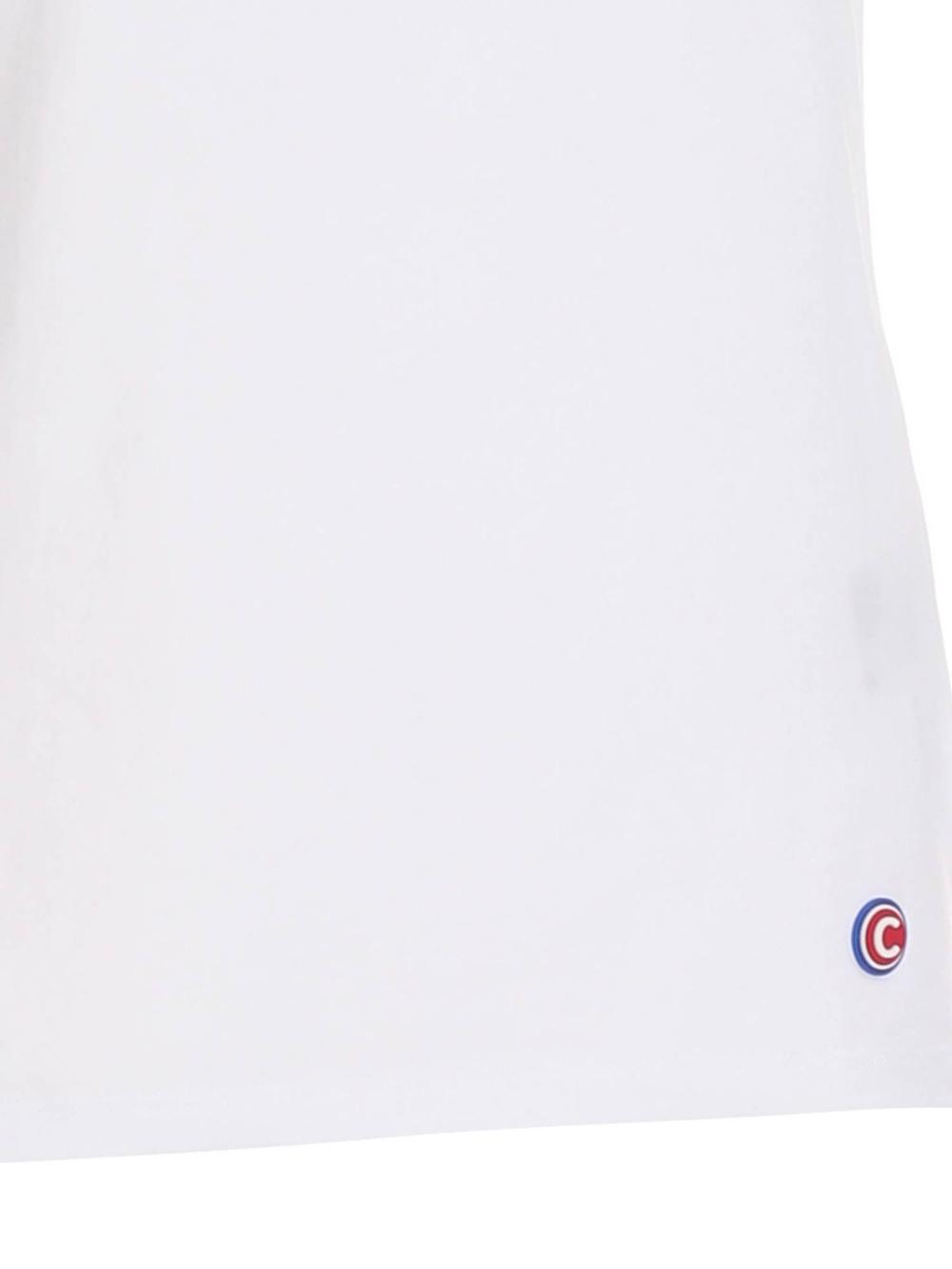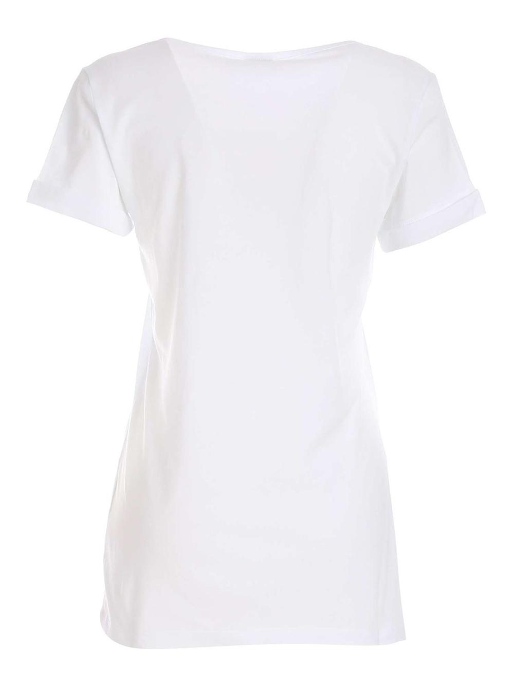 T-shirt in morbido cotone bianco, con scollo tondo e ampio e manica corta con risvolto. Logo patch applicato sul fondo. Linea leggermente svasata.