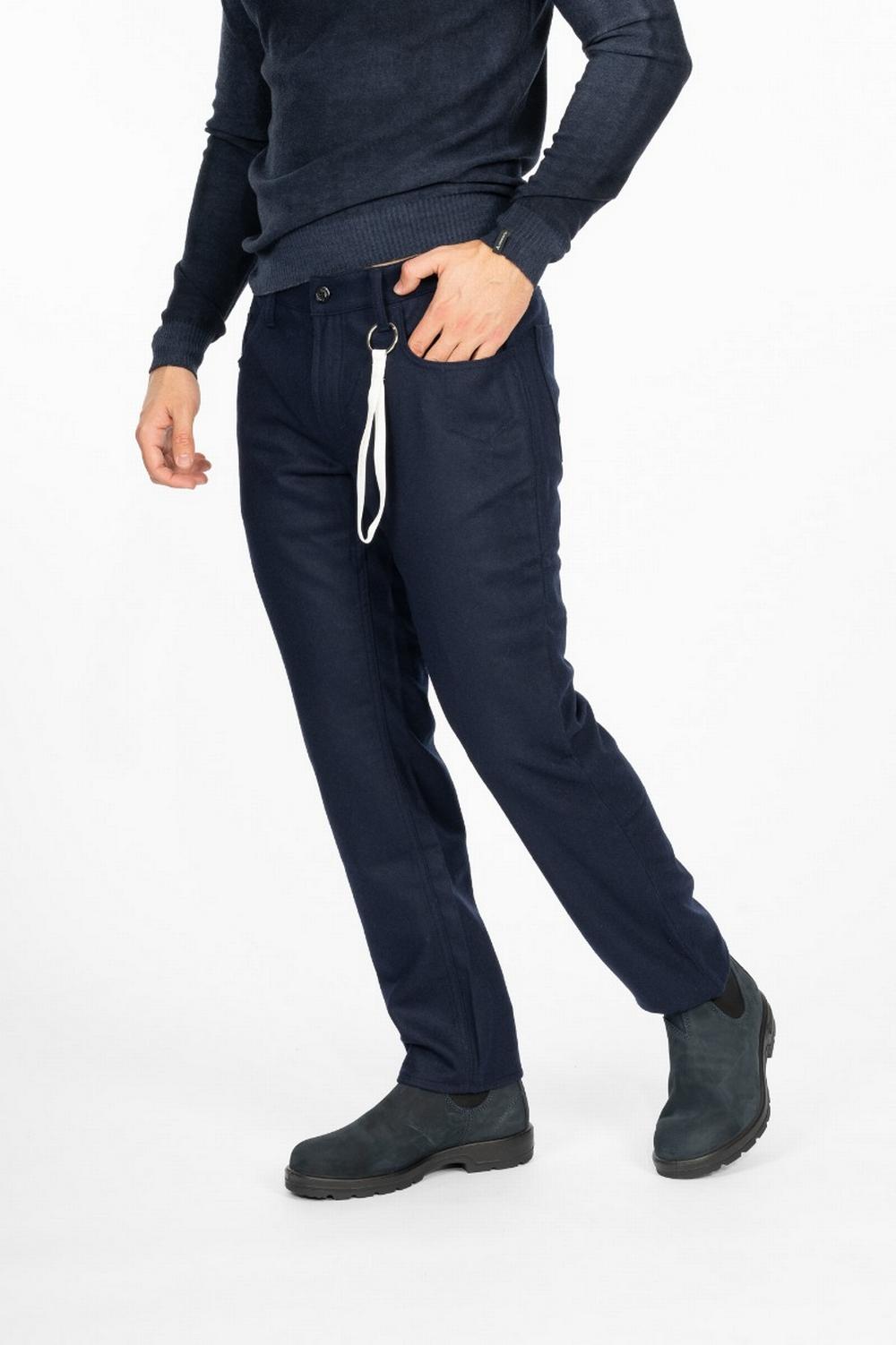 Pantalone in lana blu, modello cinque tasche, dalla linea tapered. Comodo sulla coscia, a stringere sul fondo. Chiusura con zip e bottone. Passanti in vita. Presentato con portachiavi in fettuccia bianca, removibile.