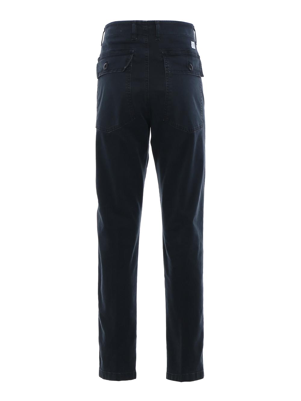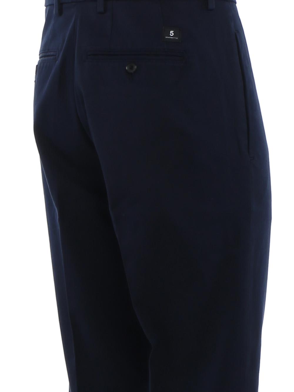 Pantalone in cotone leggermente elasticizzato color blu navy. Tasche laterali dritte e a filetto con bottone sul retro. Chiusura con zip e bottone. Piega centrale stirata. Vestibilità comoda.
