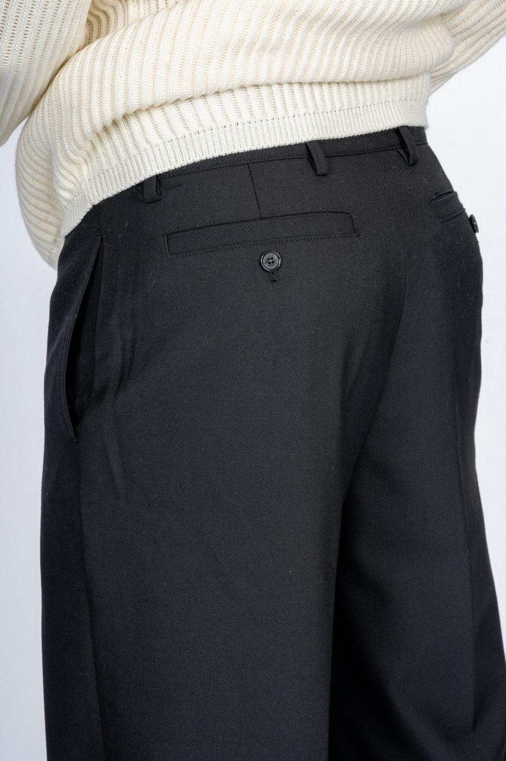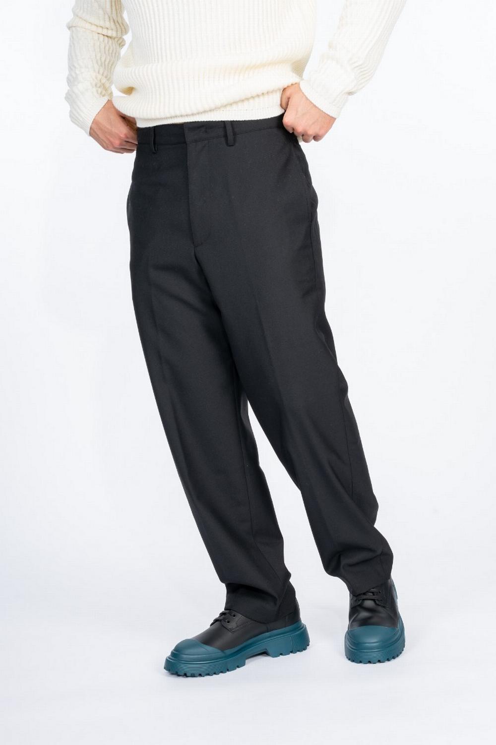 Pantalone in gabardina misto lana nero. Linea tapered, con gamba larga e dritta, vita medio-alta. Tasche inserite lateralmente. Tasche posteriori a filetto con bottone. Chiusura con zip e bottone. Passanti in vita.
