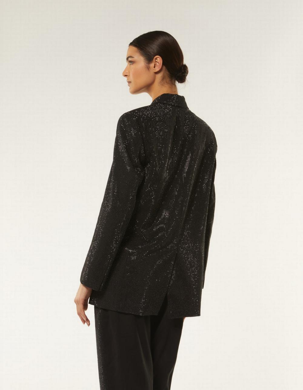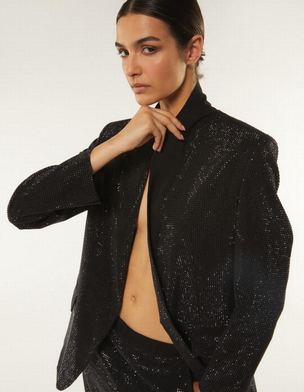 Giacca blazer in tessuto di misto viscosa di colore nero. Applicazione punti luce a brillantini su tutto il capo. Linea dritta di ispirazione maschile. Rever classico, maniche lunghe. Due tasche con patta inserite sul fronte. Chiusura monopetto a un bottone a pressione invisibile. Uno spacco posteriore centrale.