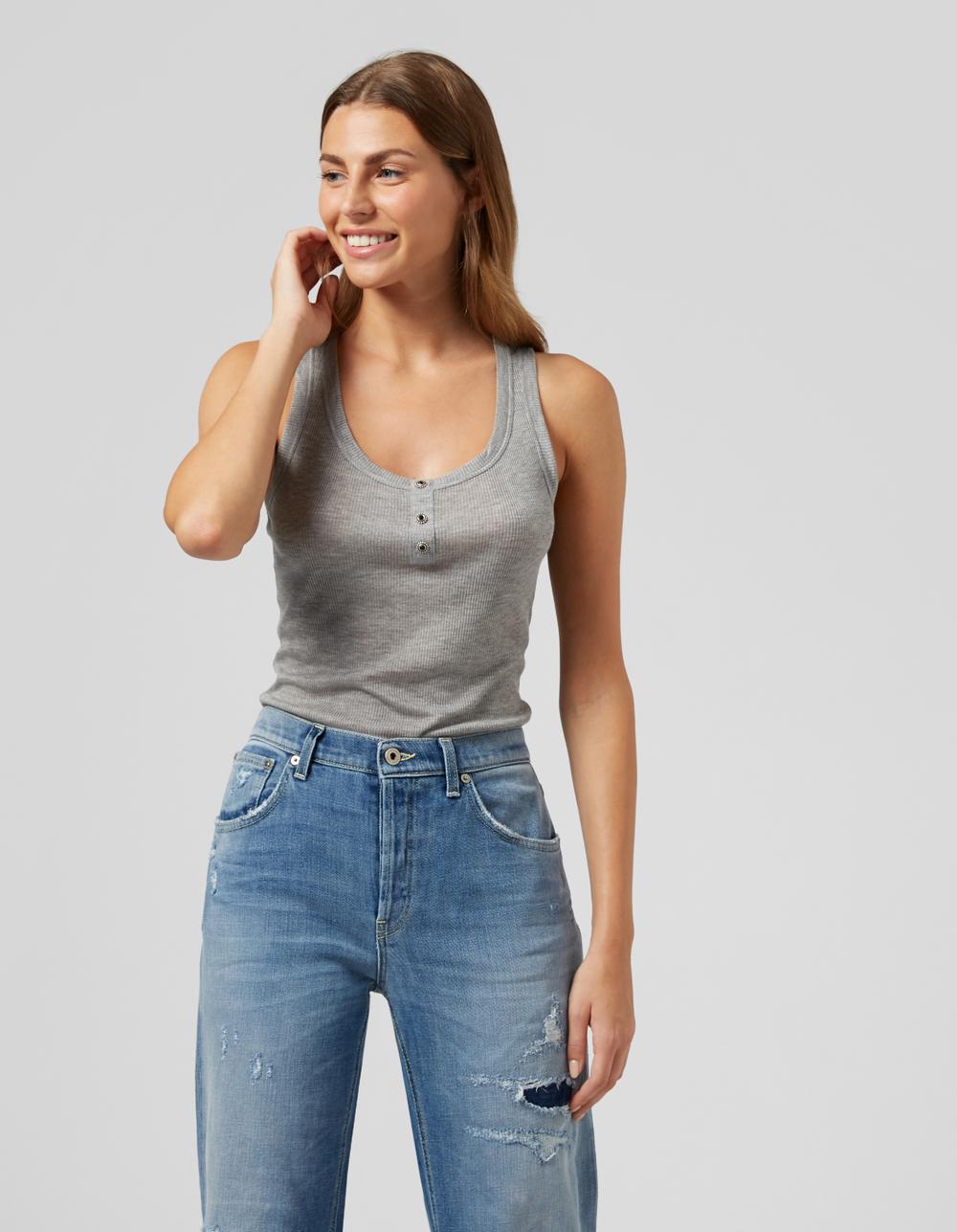 Canottina in morbido cotone modal di colore grigio medio a costine. Scollo Madonna, con bottoncini decorativi in metallo e pietra. Giromanica ampio sul retro, con logo metallico applicato. Vestibilità aderente.