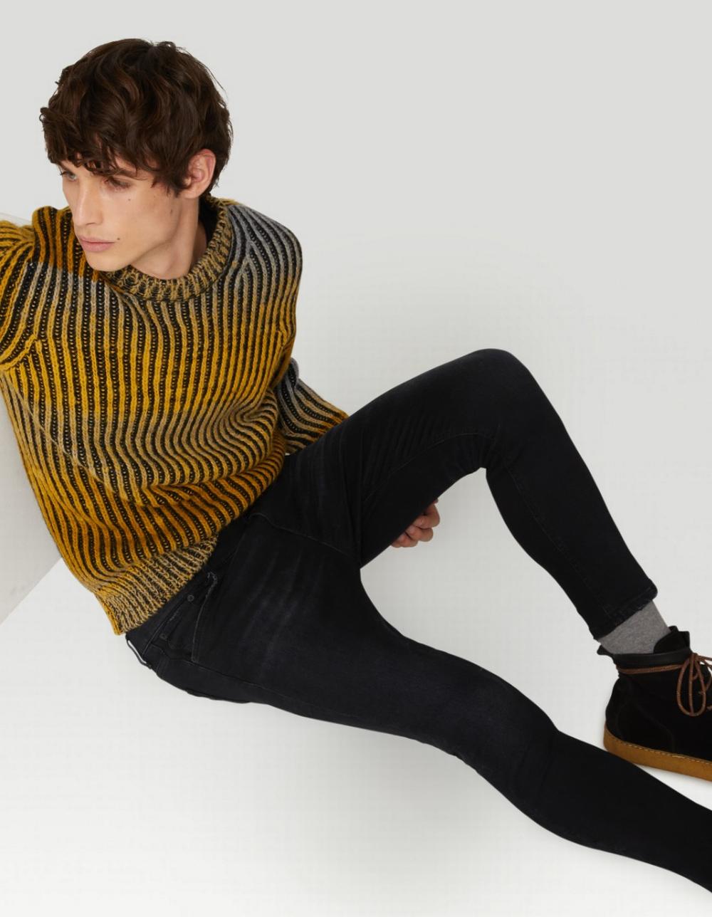 Jeans modello cinque tasche elasticizzato di colore nero. Linea superskinny aderente alla gamba. Leggere slavature e piccoli segni di usura sulle tasche. Chiusura con zip e bottone.