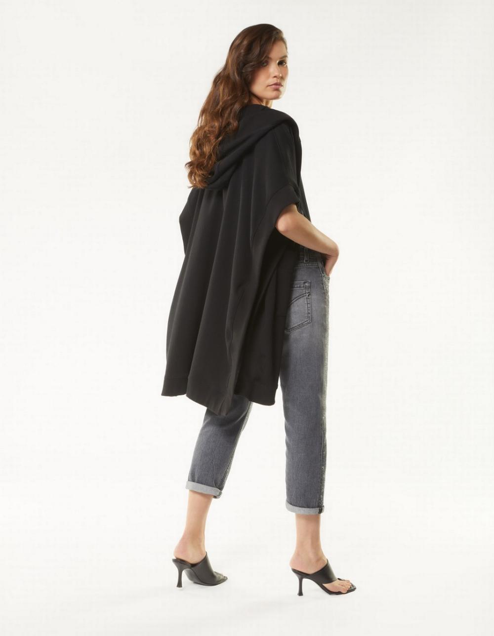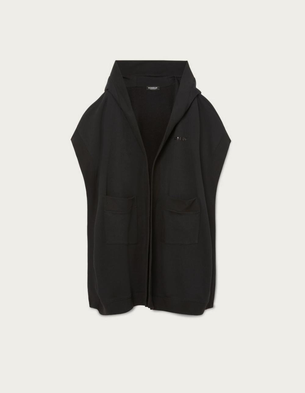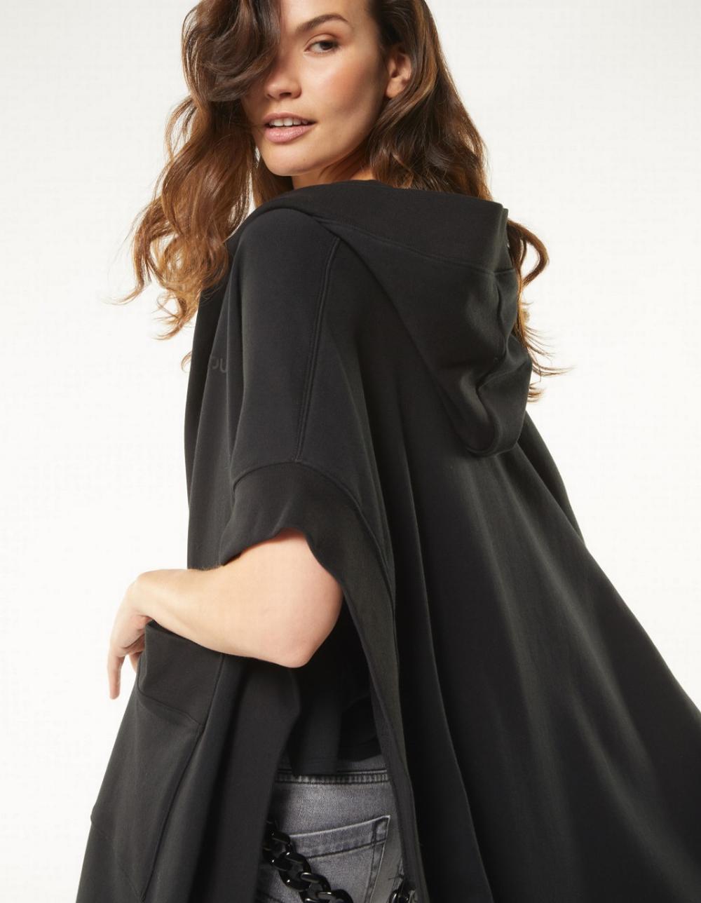 Maxi cardigan in felpa di cotone rasato colore nero. Spacco laterale che arriva fino alla spalla, chiuso da catena in plastica tono su tono. Tasche frontali applicate. Cappuccio fisso.