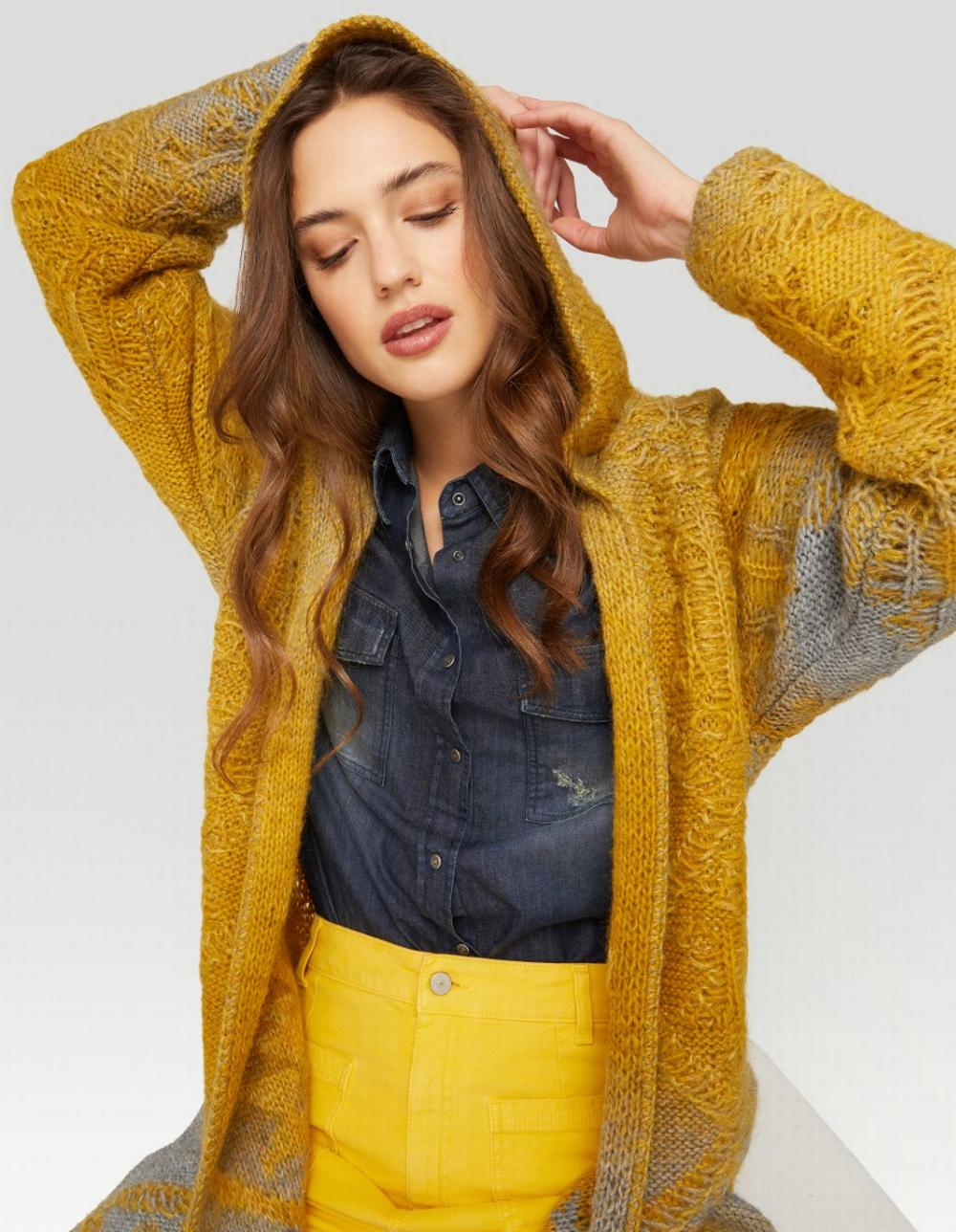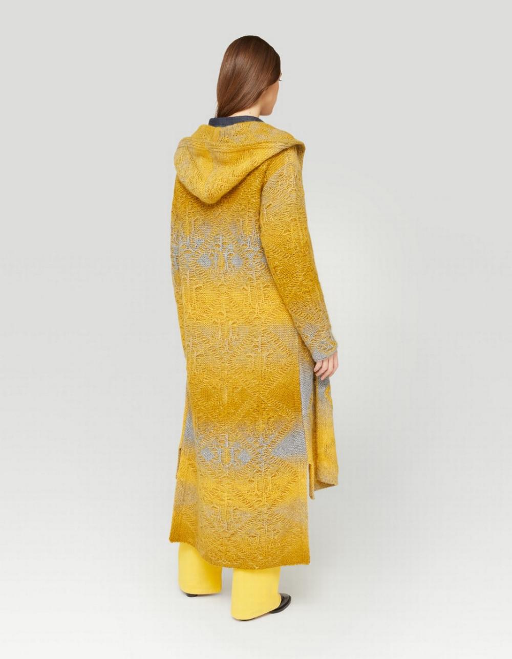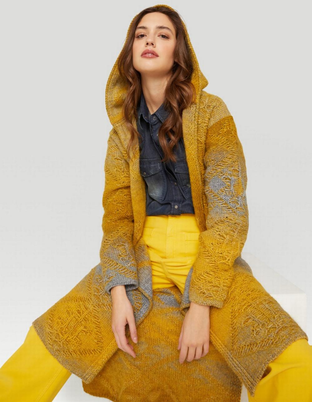 Maxi maglia utilizzabile anche come cappotto in misto lana e mohair. Lavorazione a punto onda non uniforme con altre lavorazioni a rombi. Di colore giallo senape con sfumature grigie. Cappuccio fisso. Nessun bottone o zip di chiusura. Asimmetrico più lungo sul retro con spacchetti laterali. Maniche lunghe.
