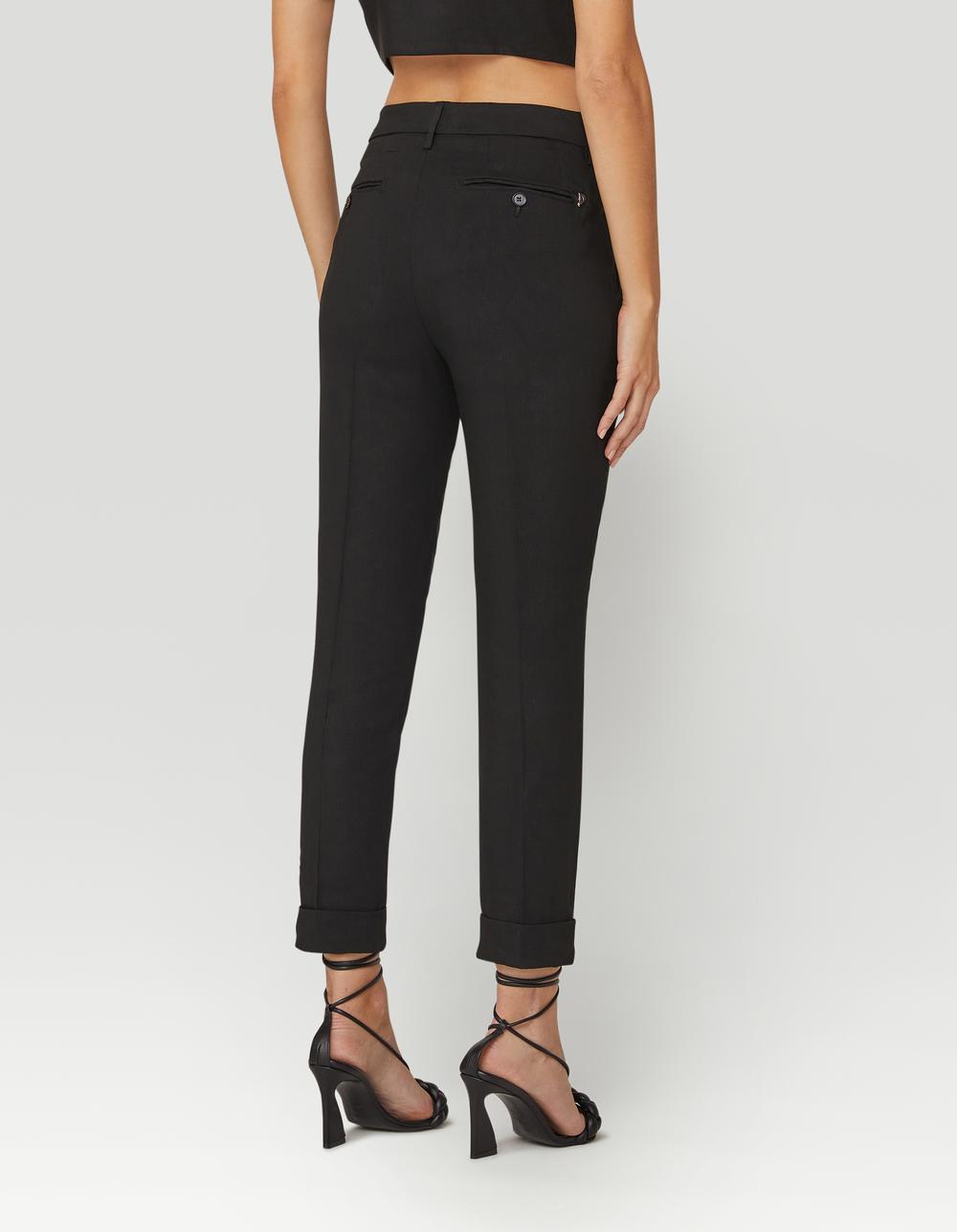 Pantalone in raso di cotone nero. Linea a sigaretta, a stringere sul fondo. Risvolto alto cucito. Vita altezza media con chiusura zip e bottone. Tasche laterali america e a filo con bottone sul retro.