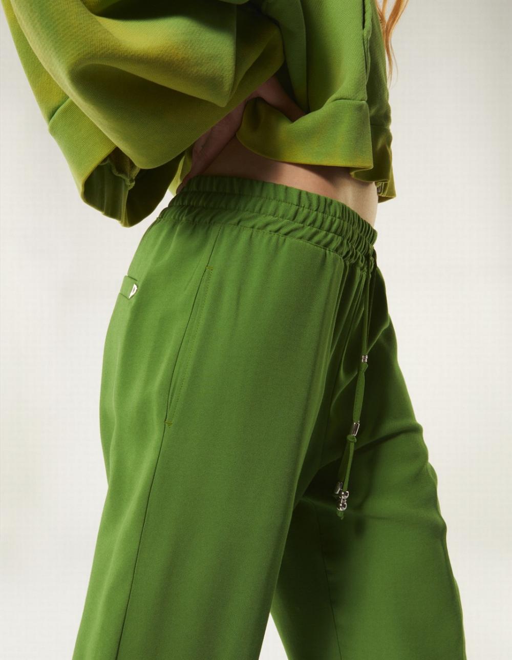Pantalone in gabardina di viscosa di color verde mela. Linea scivolata, gamba larga. Fascia elastica in vita, regolabile con coulisse, impreziosita da rivetti metallici. Due tasche laterali verticali e una posteriore a filettone