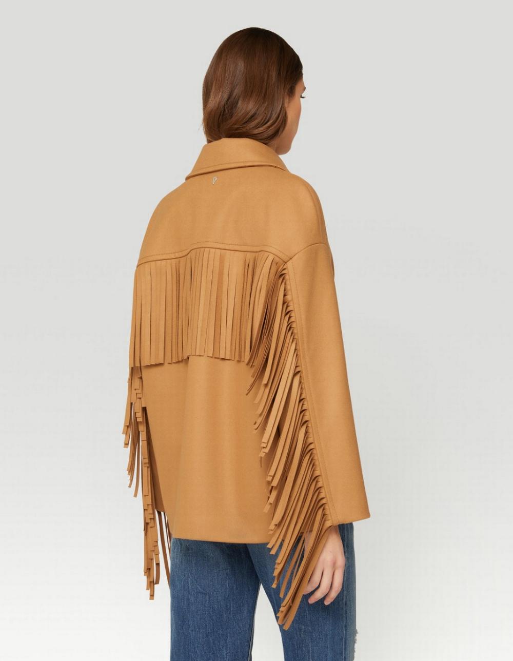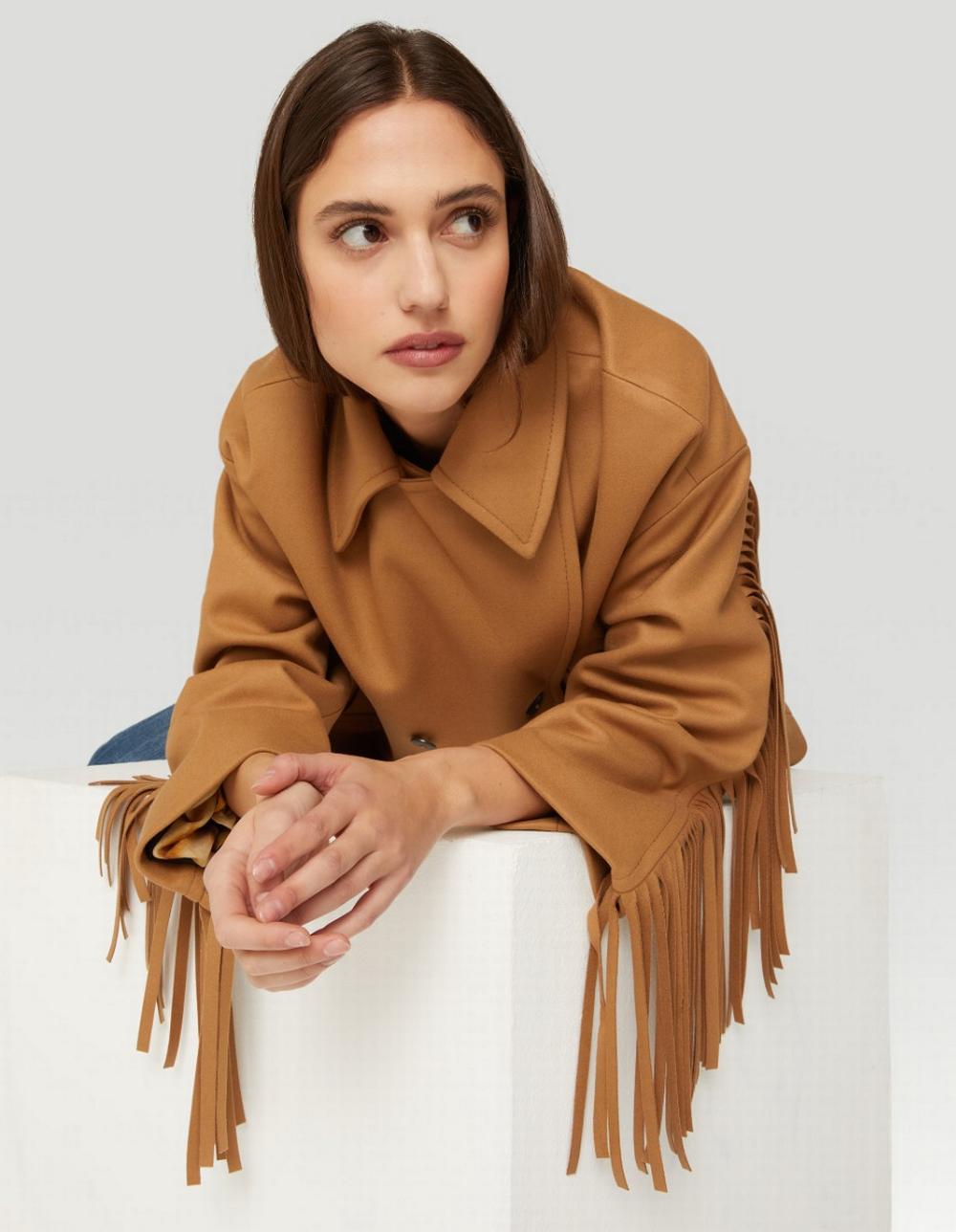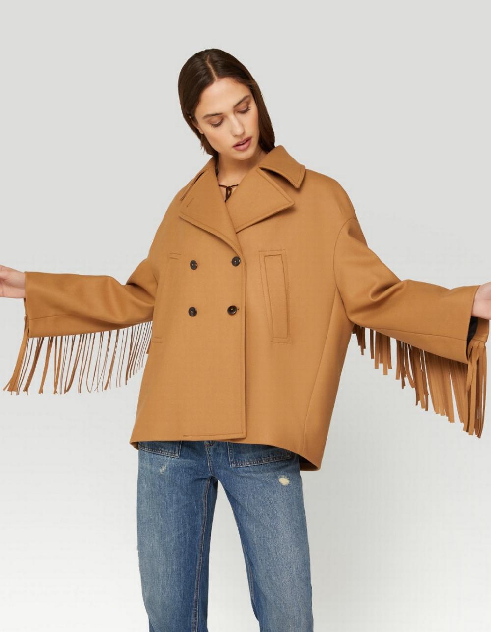 Cappotto modello peacot color marrone biscotto. Frange applicate sulle maniche che proseguono sul retro. Linea ad A, svasata, con spalla leggermente scesa. Chiusura doppiopetto con quattro bottoni a vista. Due tasche inserite a filettone. Fodera interna nera in viscosa.