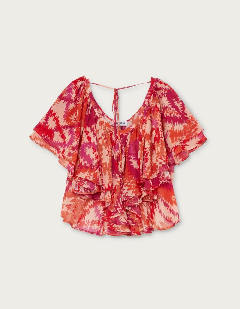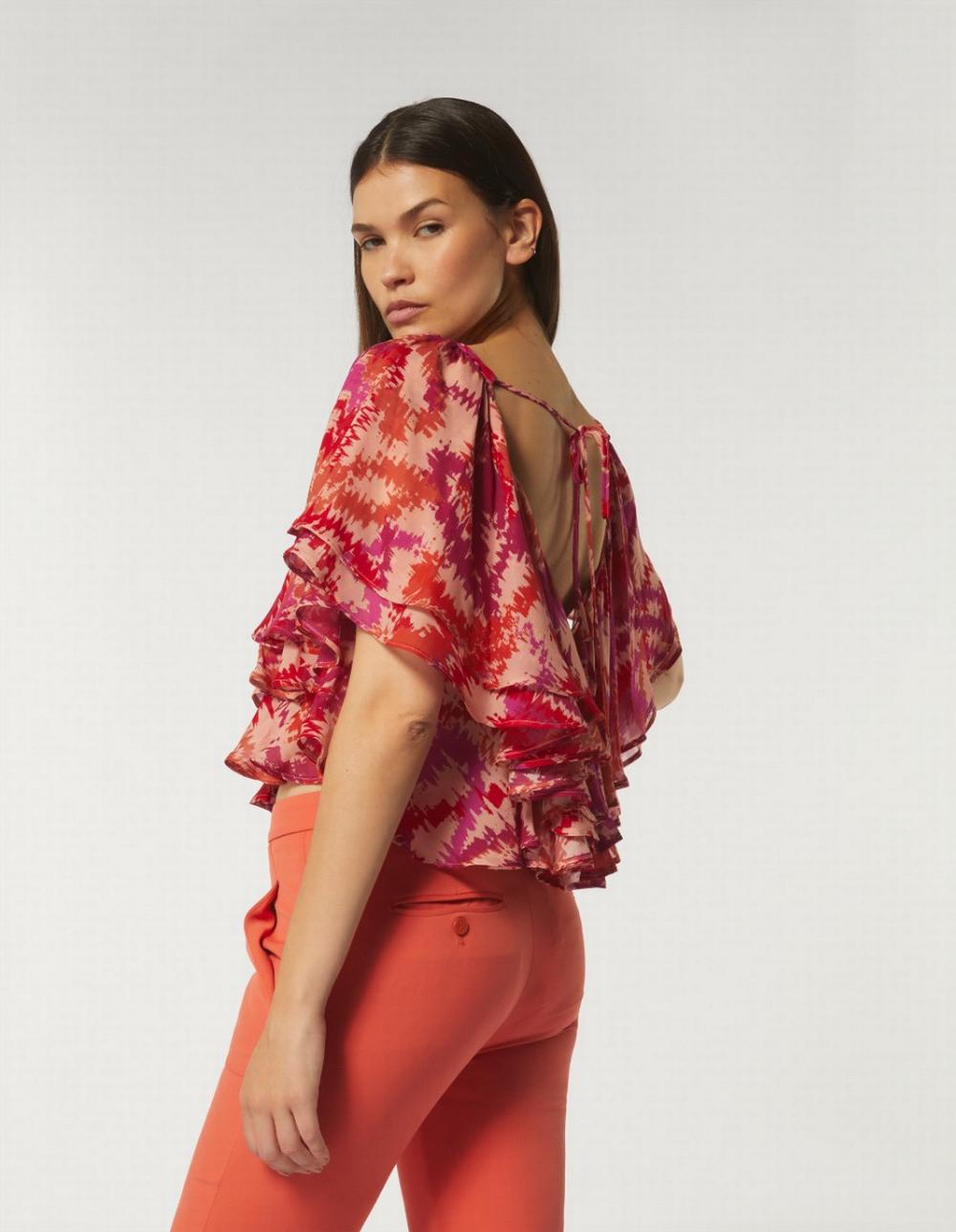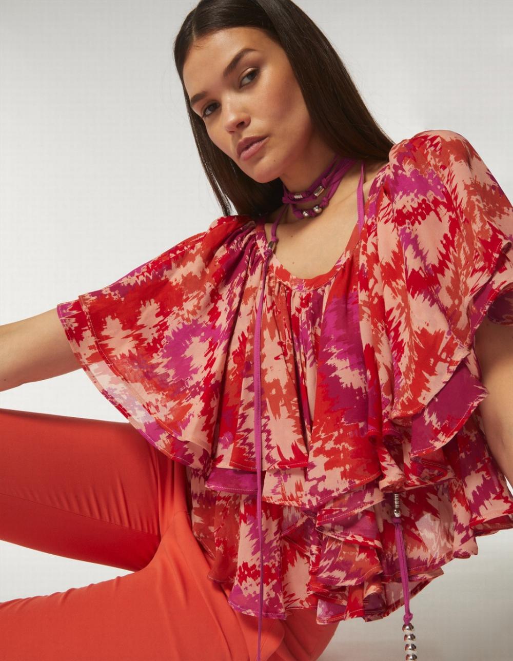 Top camicia in tessuto georgette di viscosa. Fantasia astratta simil tie-dye sui toni del rosso, viola e arancione. Scollo a giro e profonda scollatura sul retro con laccetto di chiusura. Formata da varie balze di tessuto.