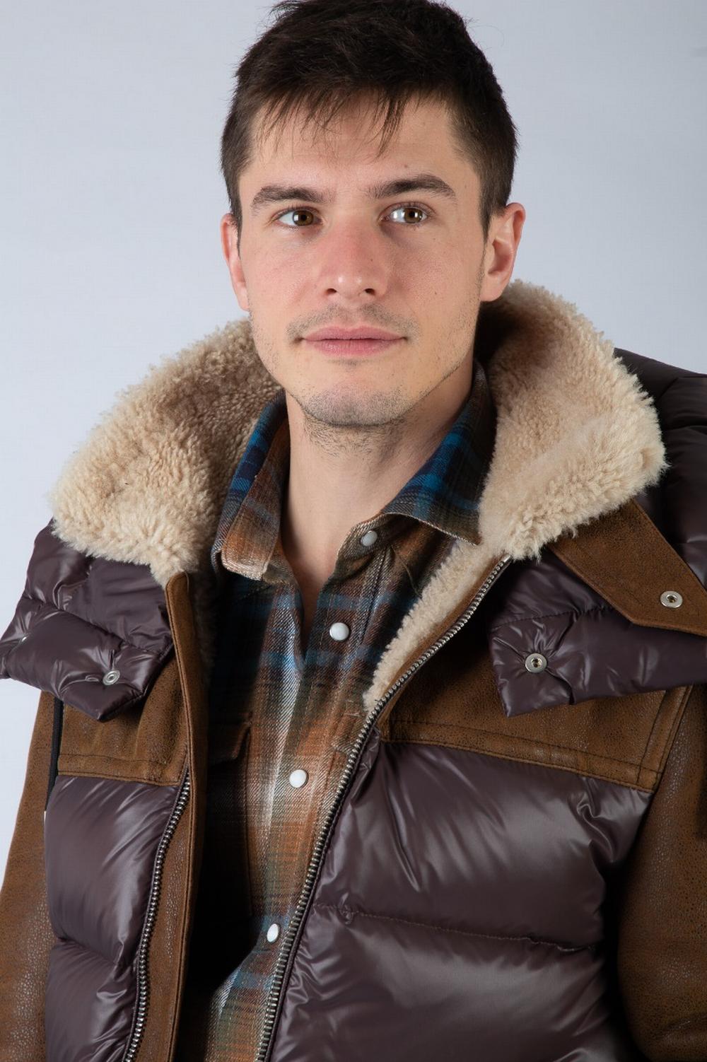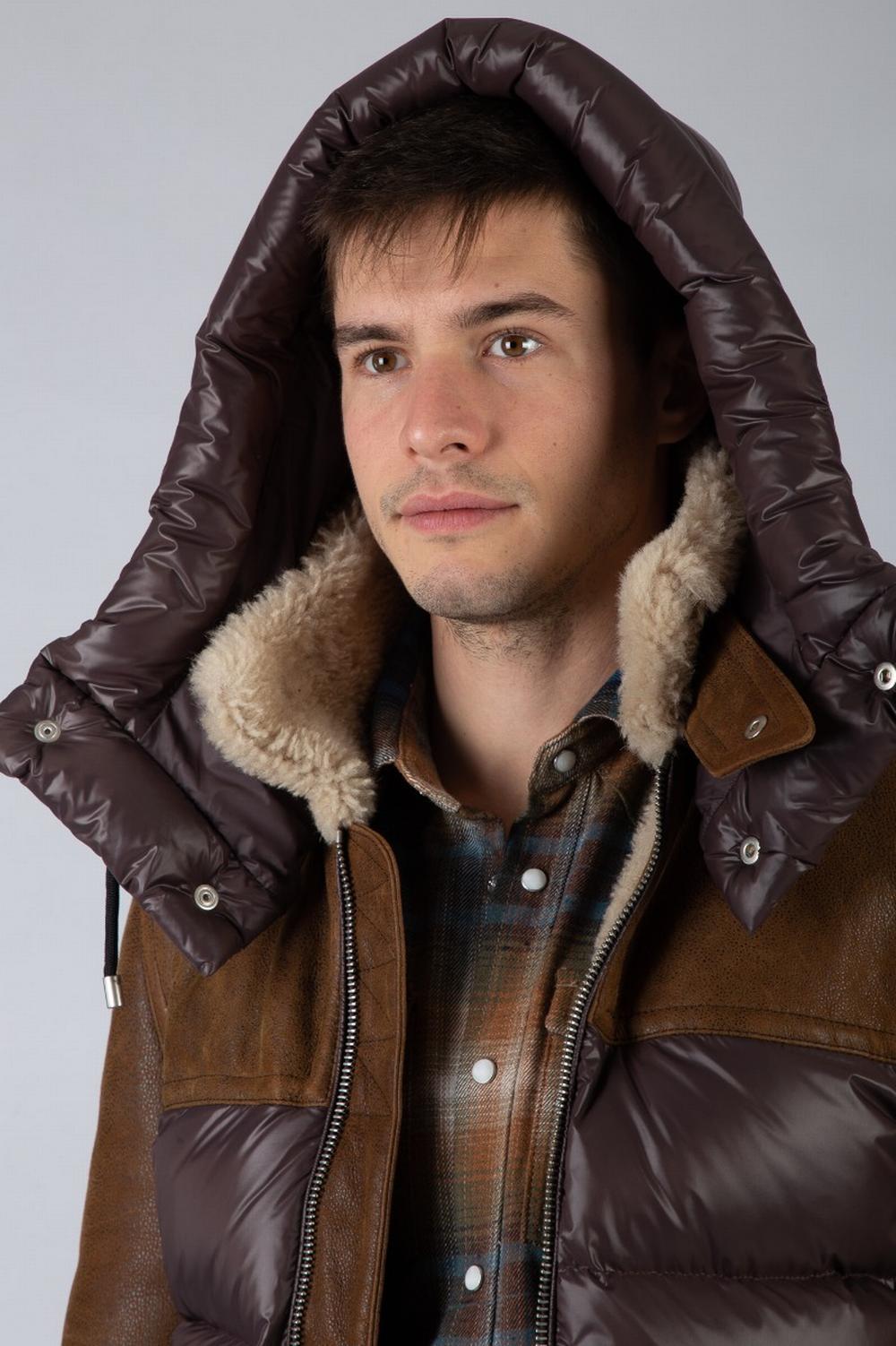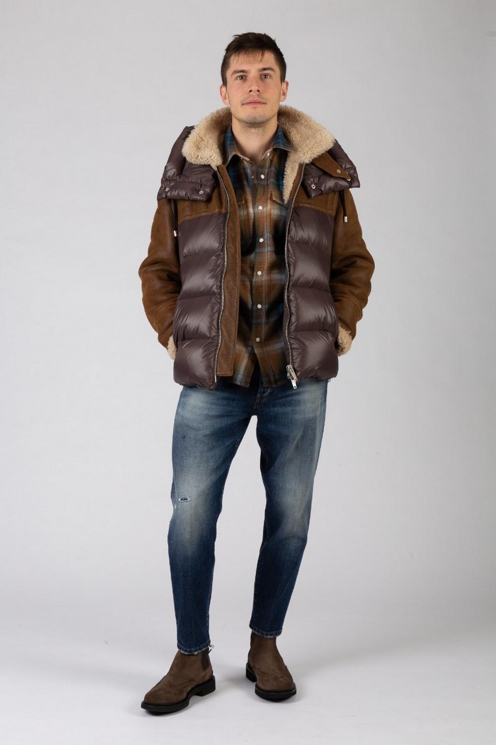 Giaccone in montone e nylon marrone, imbottito in vera piuma. Tessuto mano pesca marrone testa di moro, trapuntato su fronte e retro. Pelle sherling marrone su spalle e maniche. Cappuccio staccabile in nylon imbottito. Collo e polsi in montone beige. Chiusura con zip a doppio cursore. Tasche laterali con automatico. Due tasche interne con zip.
