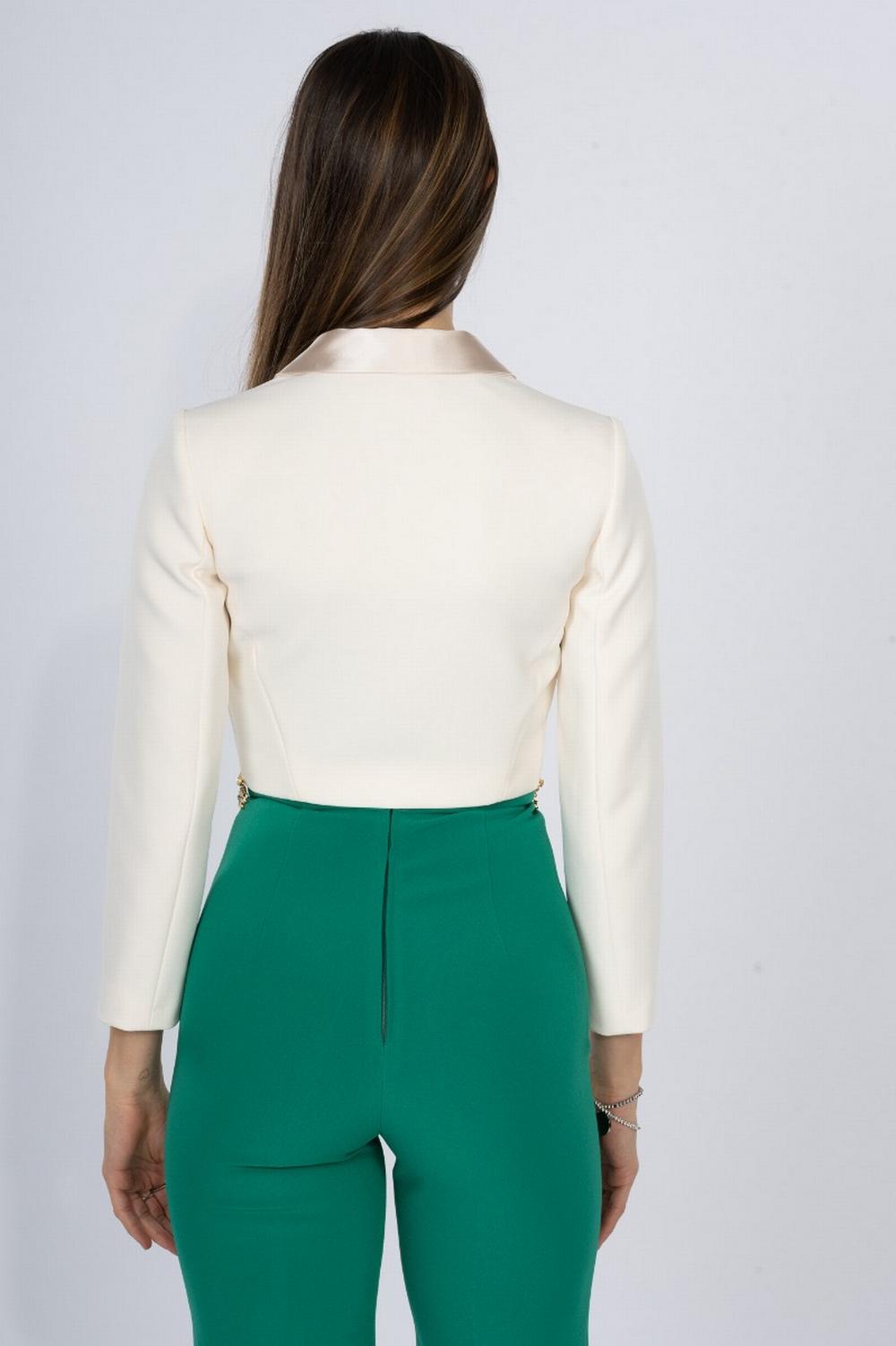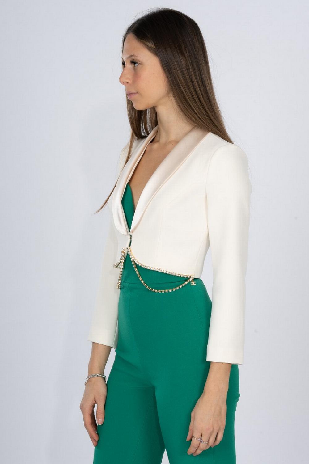 Giacca corta modello Spencer. Tessuto crepe elasticizzato di colore burro. Rever a scialle in raso tono su tono. Chiusura con gancetto. Sul fondo applicazione catena crystal a doppio filo. Fodera interna tono su tono.