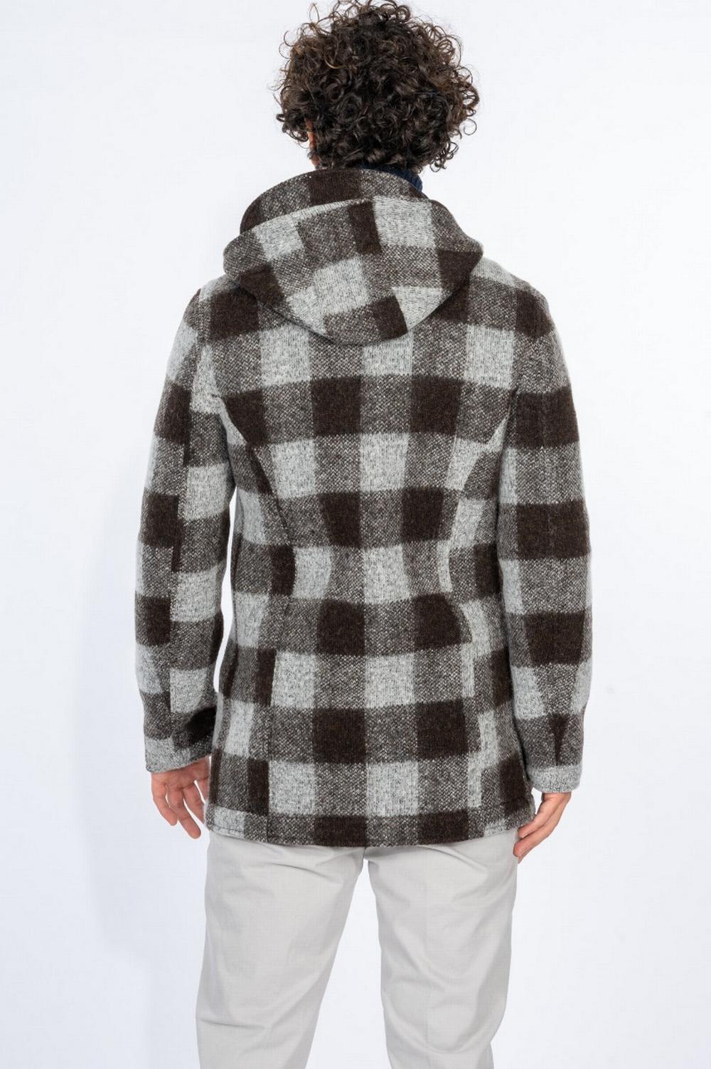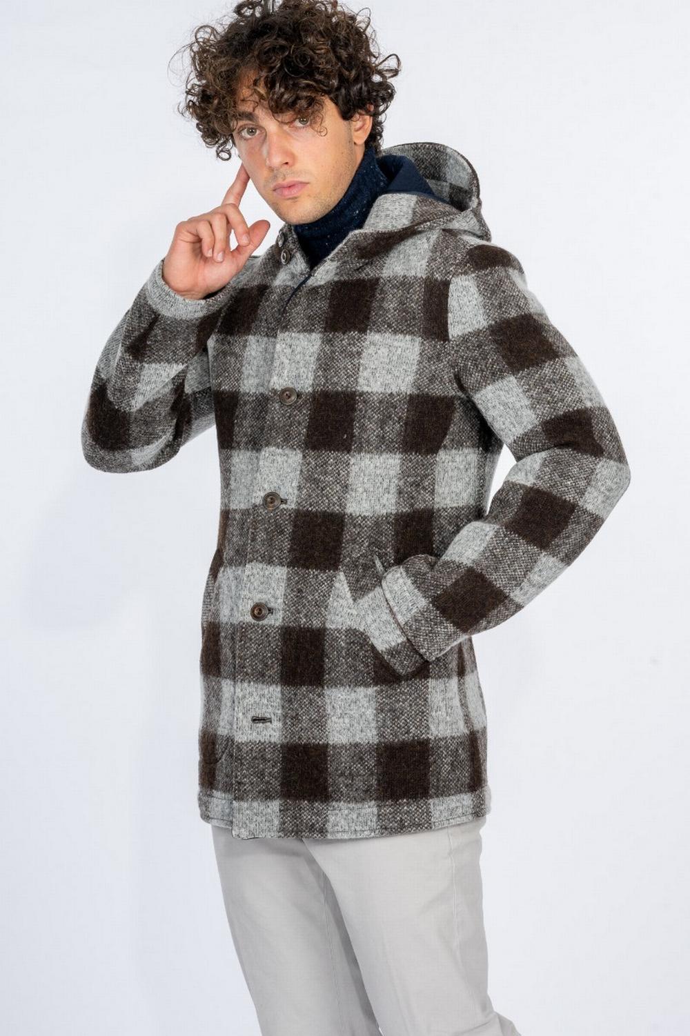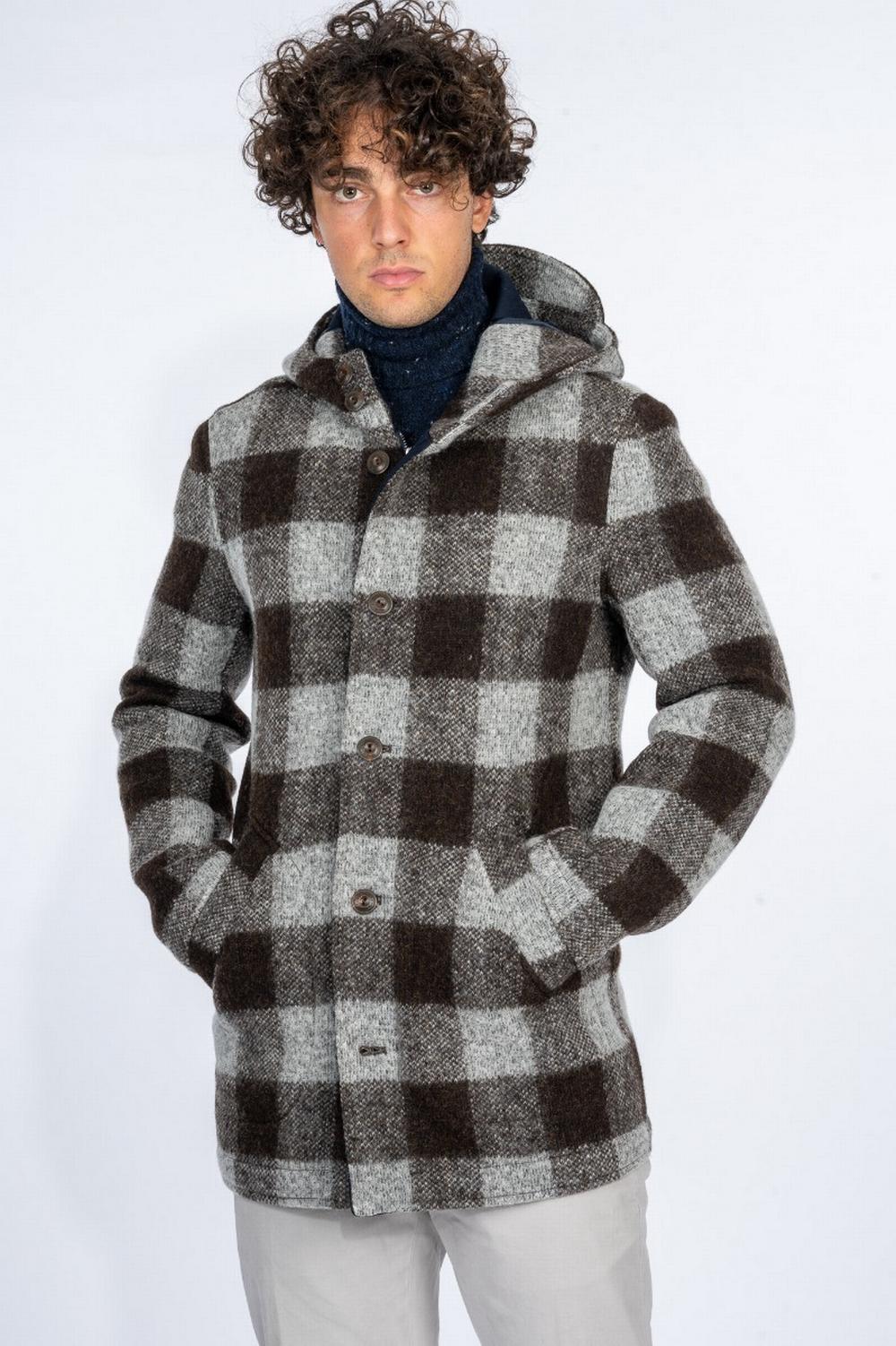 Giaccone modello parka, in misto lana con fantasia check marrone e grigio. Effetto pelo. Cappuccio fisso con colletto alto e avvolgente. Chiusura con zip nascosta e bottoni. Tasche oblique con filettone. Interno in neoprene blu. Lunghezza media.