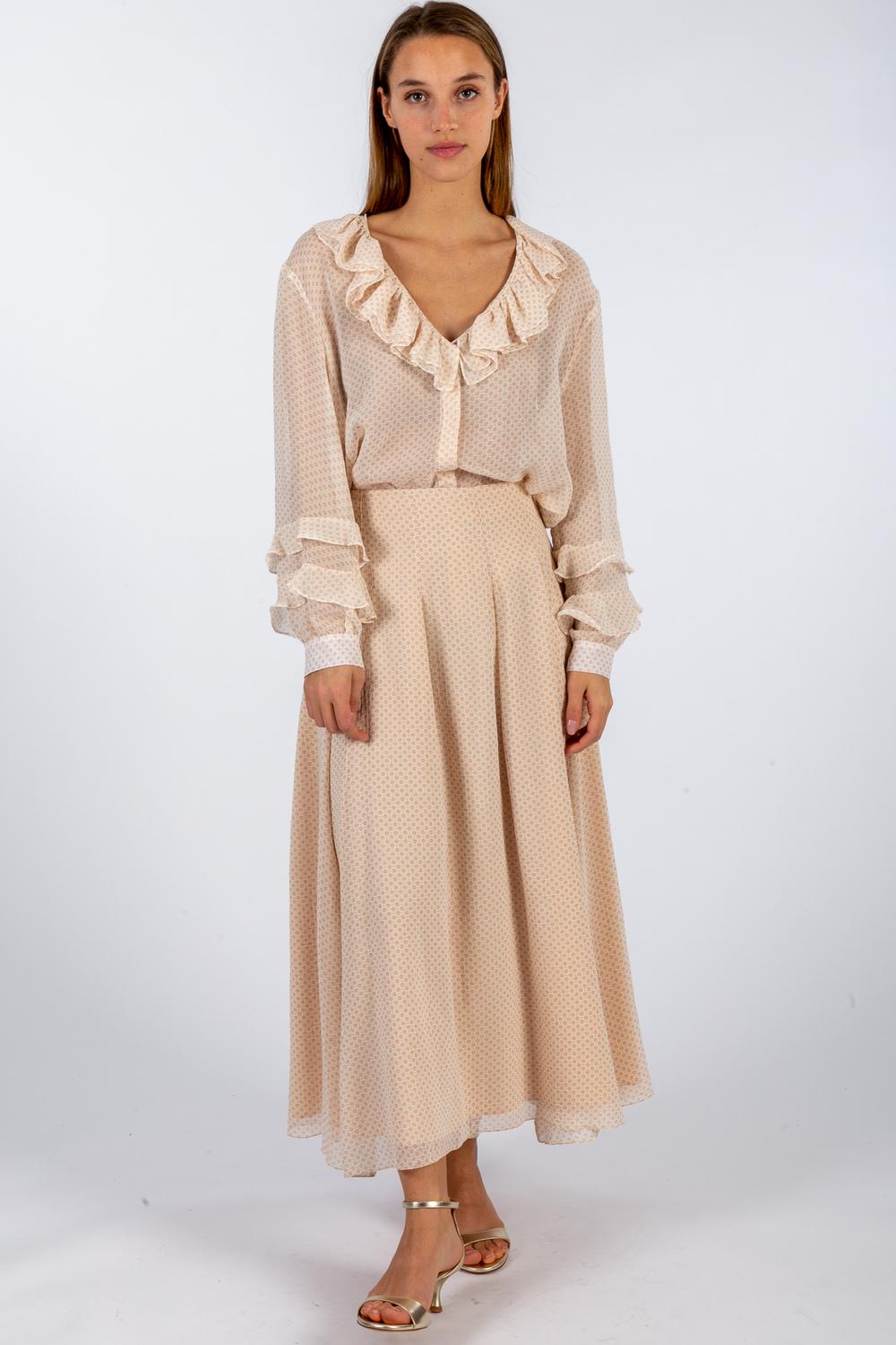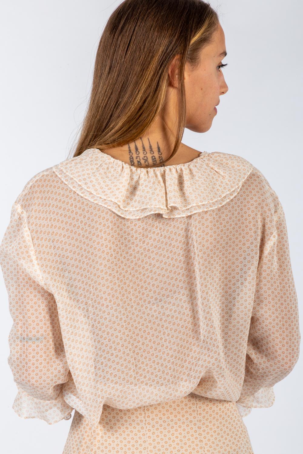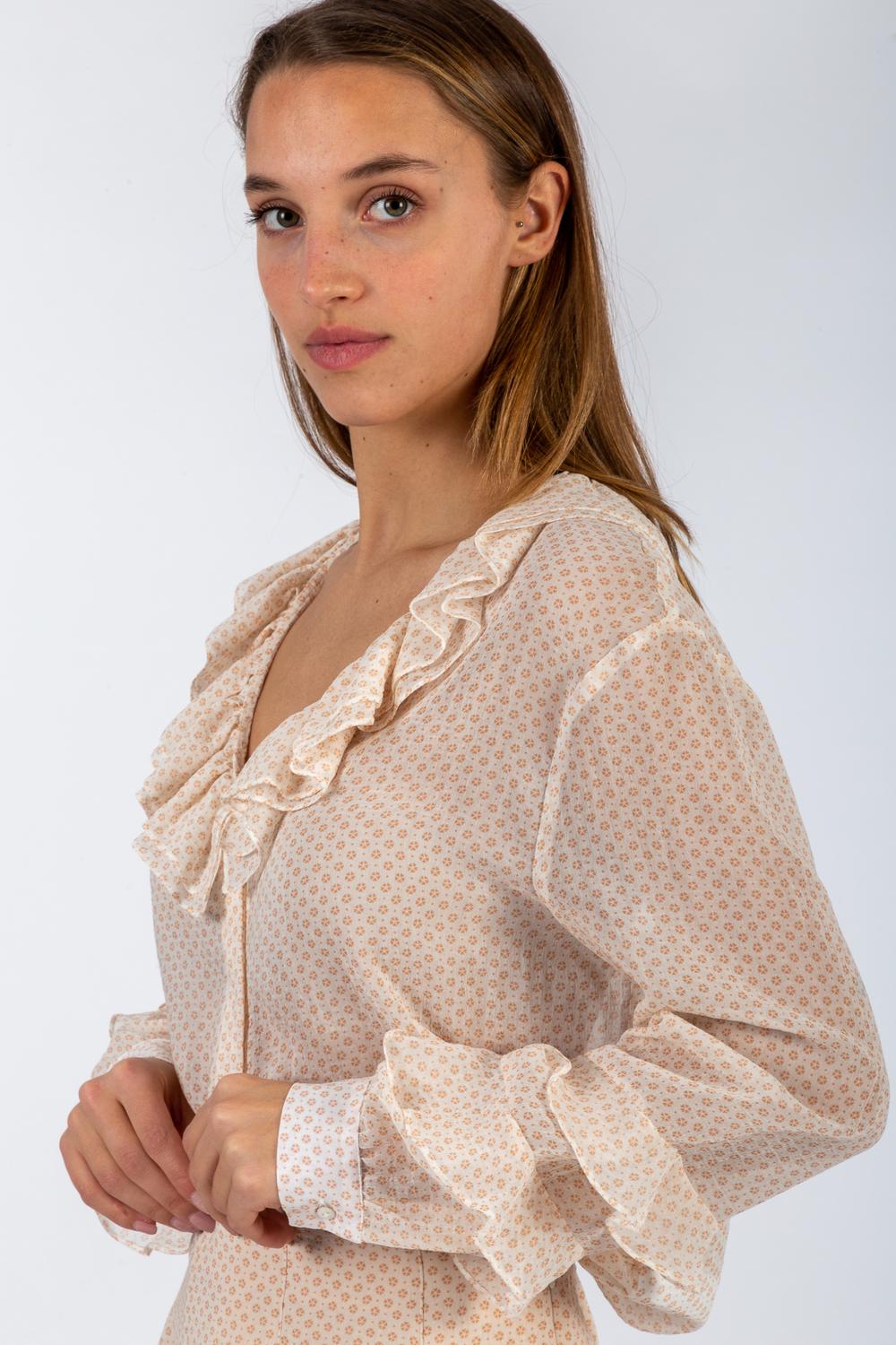 Camicia in tessuto semitrasparente misto seta, con stampa a fiorellini rosa chiaro. Scollo a V con rouges sui bordi e chiusura con bottoni nascosti. Spalla scesa e manica con rouges sul fondo. Linea morbida.