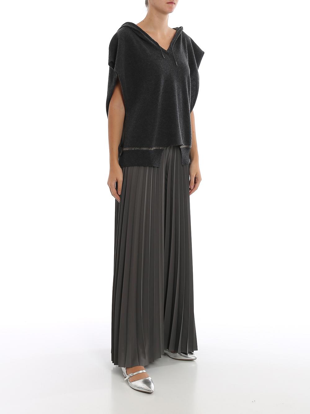 Maglia in lana grigia impreziosita da seta e cachemire. Senza maniche con profondi tagli laterali. Vestibilità over. Cappuccio fisso con coulisse, scollo a V. Fondo a costina, profilato da applicazione con catenella silver, tagliato frontalmente a semicerchio.