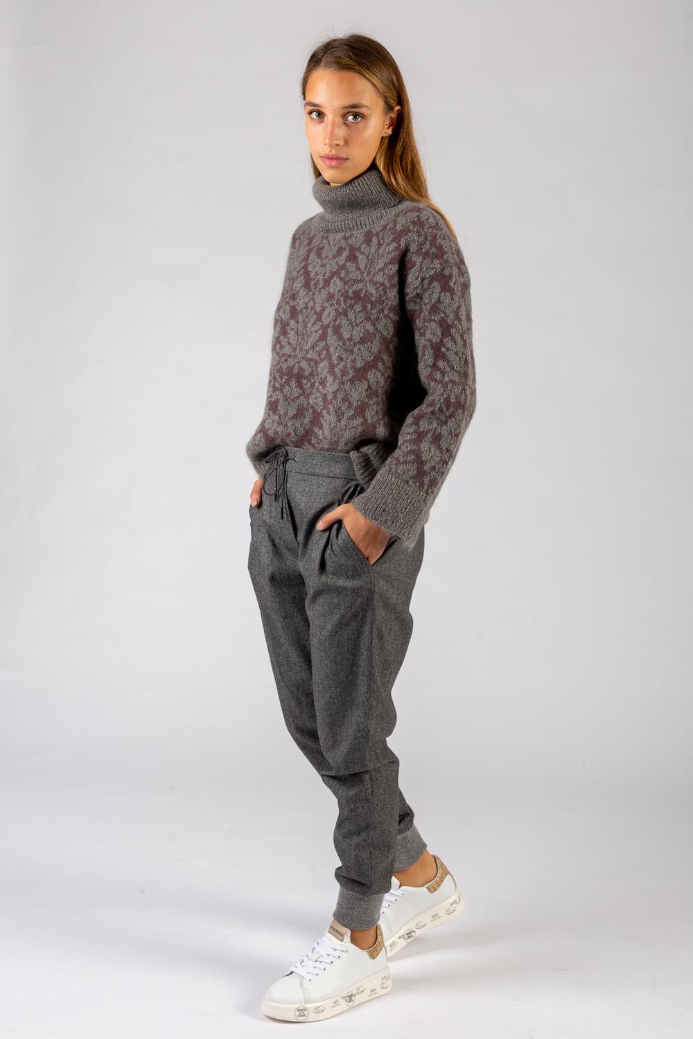 Pantalone modello jogging, in morbida lana misto cashmere di colore grigio. Coulisse in vita con elastico sul retro. Tasche laterali america. Una pence. Polsino in maglia grigio chiaro sul fondo.