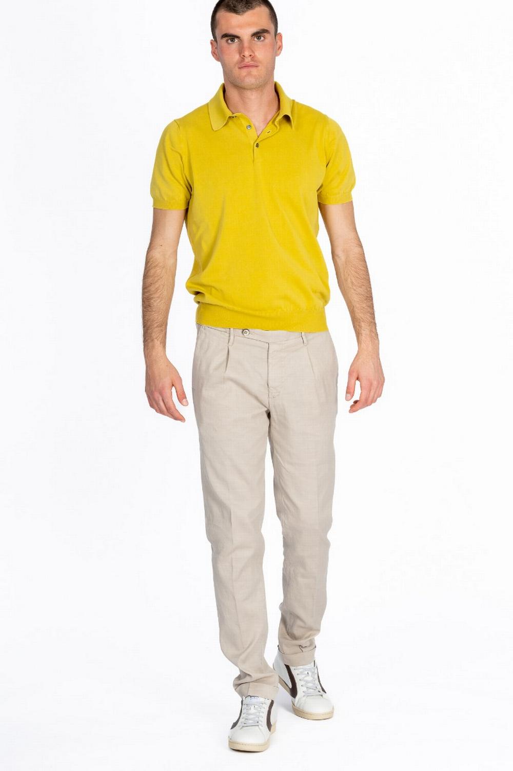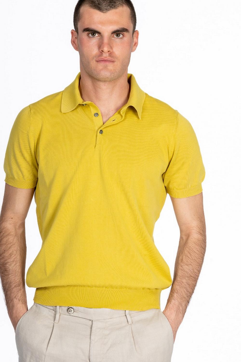 Polo in maglia di cotone morbido. Maniche corte. Colletto classico con tre bottoni. Bordi a costina. Color giallo senape.