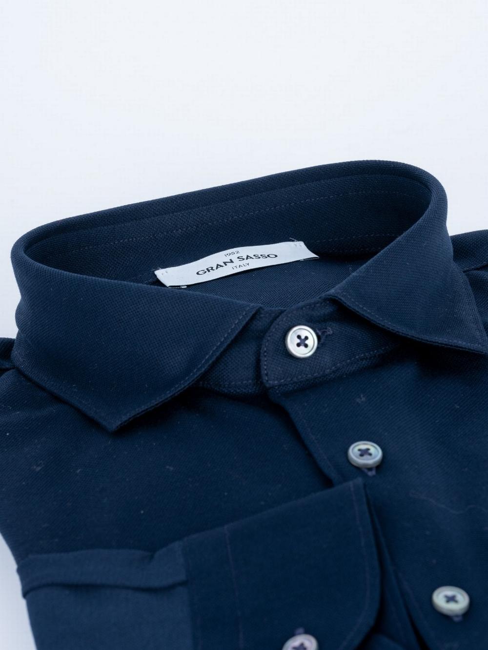 Camicia in puro cotone blu, filo di Scozia lavorato a nido d'ape. Collo alla francese. Polso tondo. Tessuto finissimo di alta qualità. Slim fit.