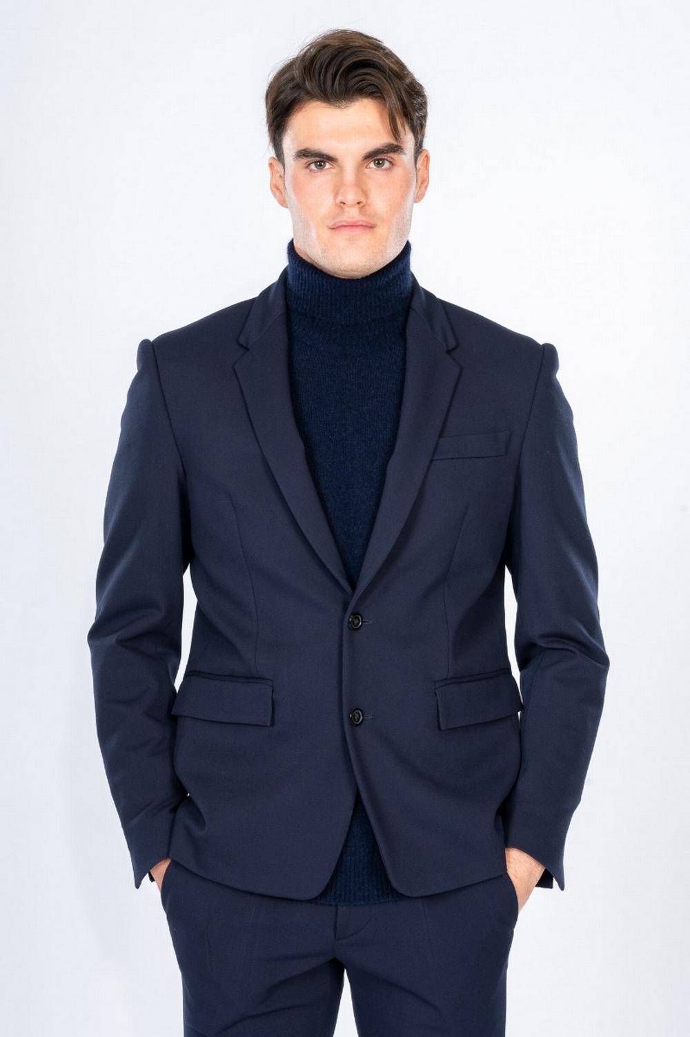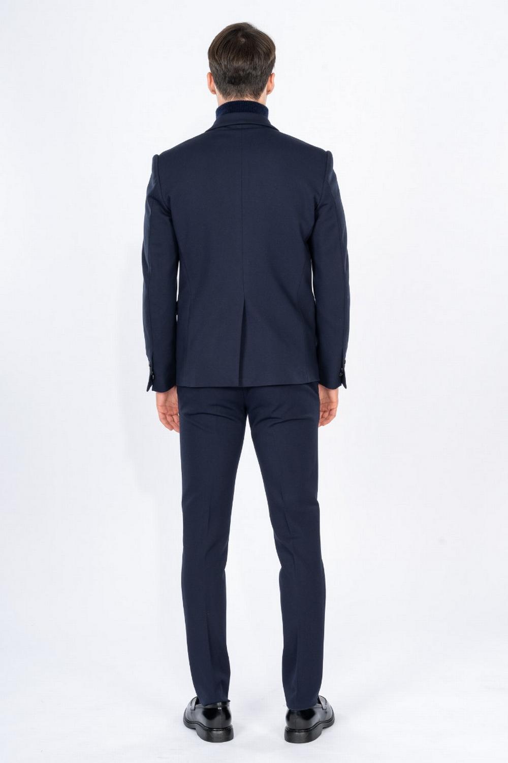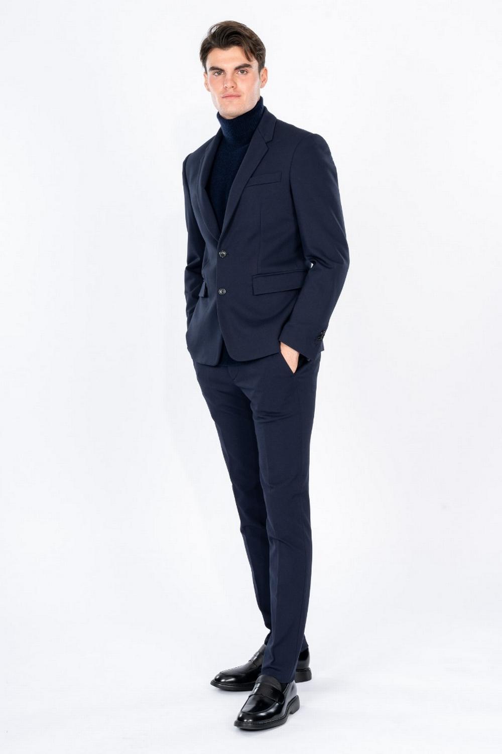 Abito completo in viscosa elasticizzata di colore blu navy. Linea slim sia per la giacca sia per il pantalone. Giacca monopetto a due bottoni con rever classico. Due tasche inserite con patta di chiusura e una a filettone sul petto. Foderata internamente. Manica con bottoni aperti. Pantaloni con due tasche laterali e due posteriori a filetto.