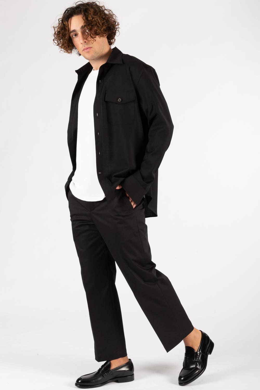 Camicia in fresco di lana nero. Linea over. Chiusura con bottoni. Due tasche con patta e bottone applicate al petto. Fondo stondato.