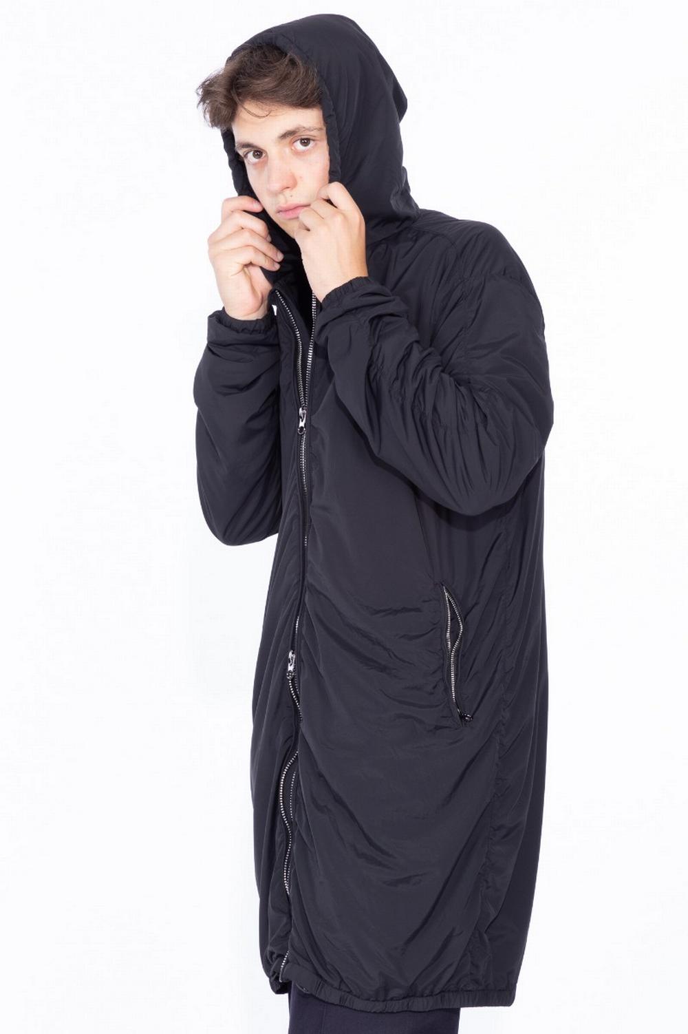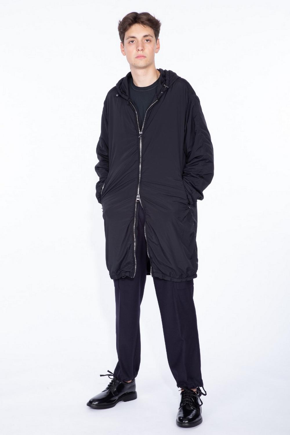 Giubbino lungo leggermente imbottito in nylon elasticizzato di colore nero. Non trapuntato. Chiusura full zip a vista doppio cursore con protezione finale sul collo. Cappuccio fisso con coulisse e tiranti. Polsi elastici. Banda elastica sul fondo, regolabile. Due tasche esterne con zip e una interna.