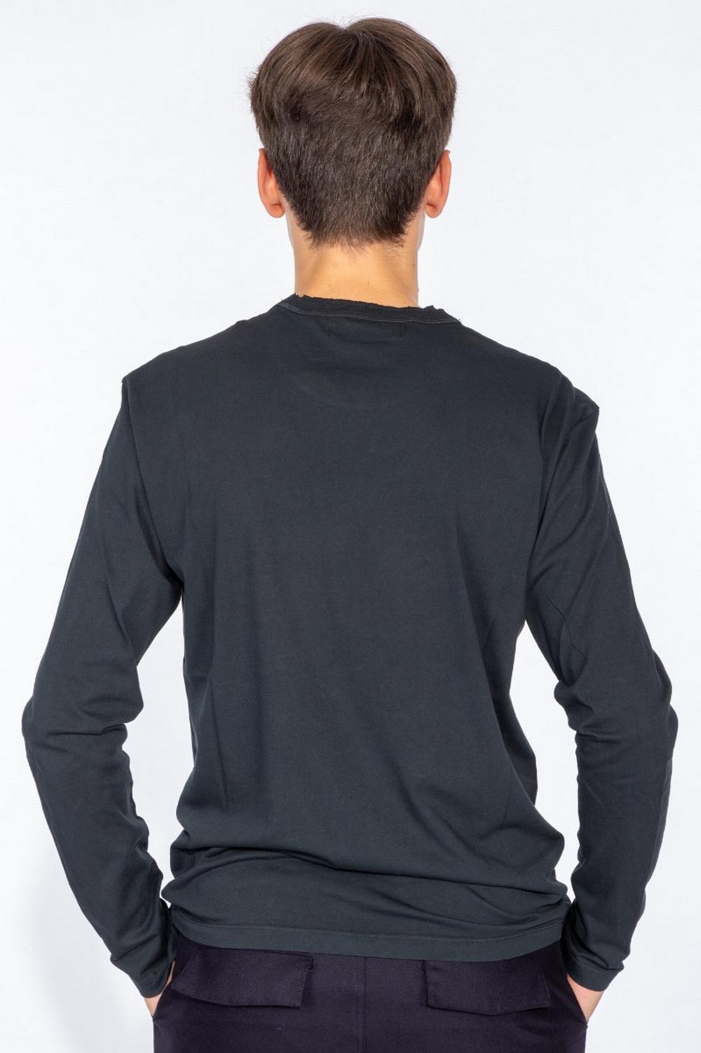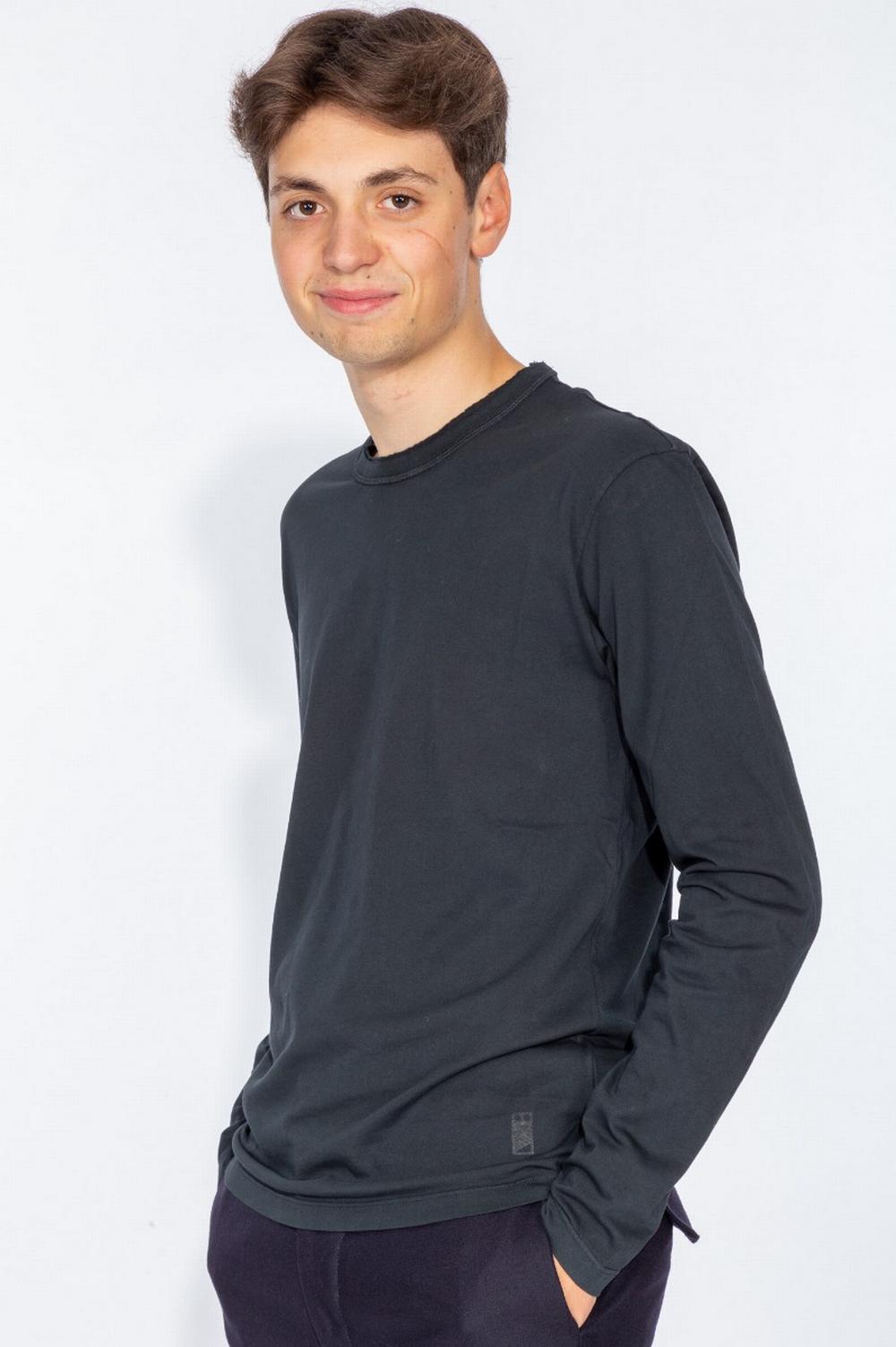 T-shirt a manica lunga in cotone di colore blu. Linea dritta, leggermente aderente. Colletto doppio taglio vivo effetto non finito.