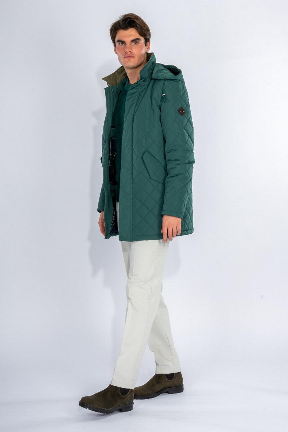 Giaccone modello parka, in nylon opaco verde pino, con trapuntature a rombi. Imbottitura in ovatta. Cappuccio staccabile con zip. Chiusura con zip e automatici nascosti. Tasche laterali inserite con patta e automatico. Colletto in velluto verde. Doppio polso in maglia elasticizzata. Fodera interna fantasia scozzese. Tre tasche interne. Lunghezza media.