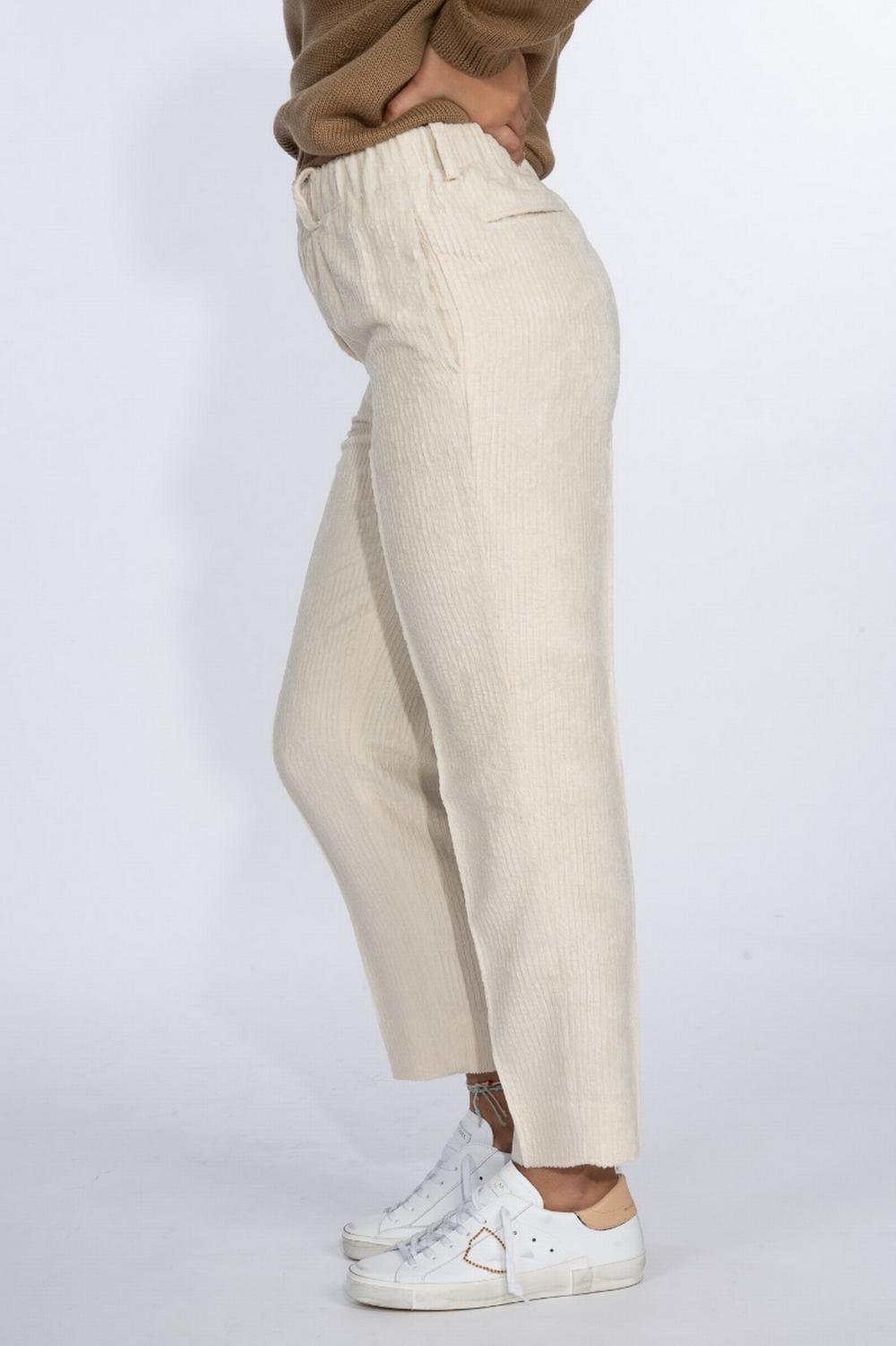 Pantalone in morbidissimo velluto a coste larghe color panna. Elastico in vita e passanti per cintura. Finta patta copri zip. Tasche laterali inserite e posteriori a filetto. Vita medio-alta, gamba morbida sulla coscia, a stringere sul fondo. Piega centrale stirata.