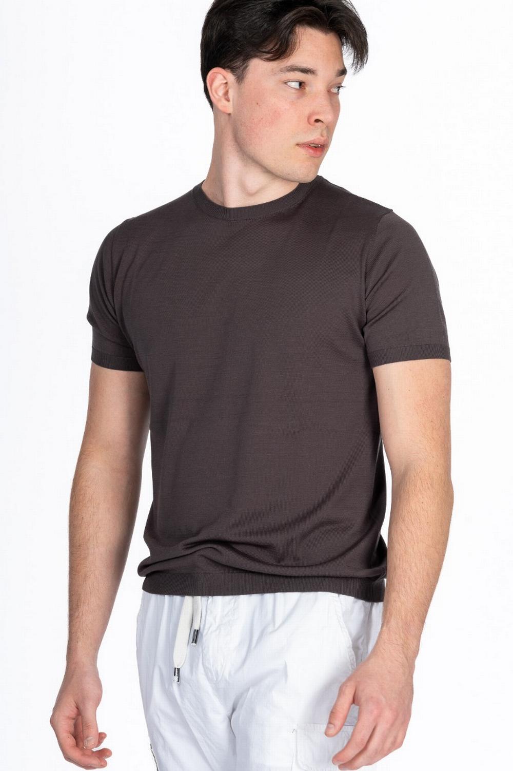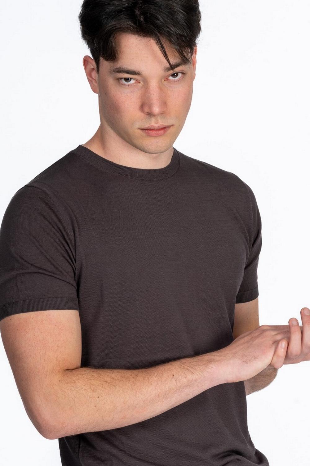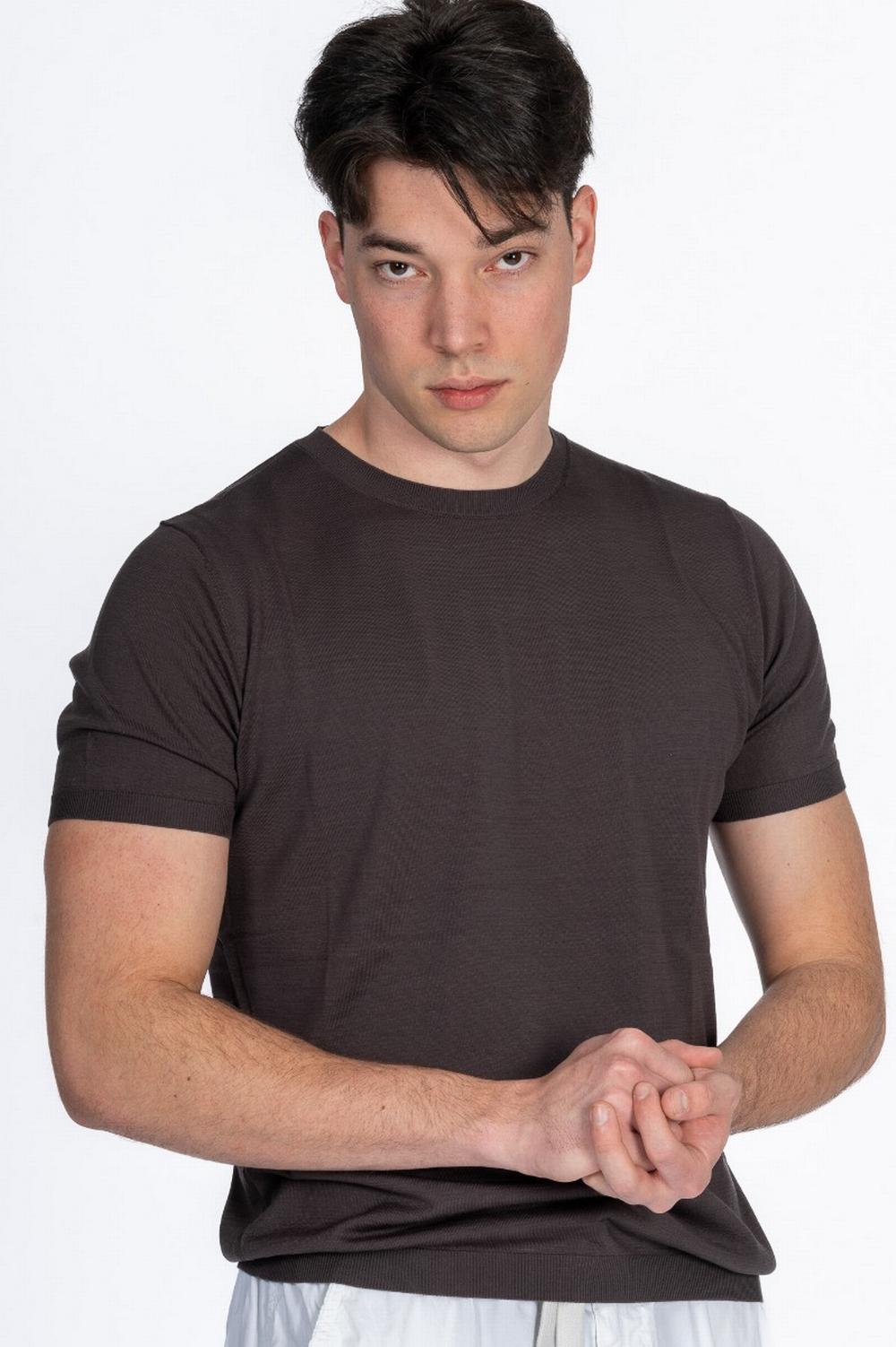 Maglia in seta e cotone color marrone ebano. Maniche corte, scollo a giro, linea dritta. Scollo, polsi e fondo in costina.